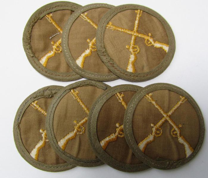 I recently encountered a small stack comprising of 7 - fully identical - examples of the so-called 'tropical-style' trade- and/or special career insignia (ie. machine-embroidered speciality arm-patches) as were intended for usage by a: 'Waffenmeister' (or weapon-equipment NCO), all seven pieces in overall very nice (ie. virtually mint-/unissued!) condition. The patches are all neatly machine-embroidered on a brownish-green coloured and/or linnen-based background and show a neat reinforced border as is more often encountered with these tropical-style examples. The patches are not maker-marked and show some minimal staining only (IMO simply caused by decades of storage only). All examples are neatly 'backed' with light-brown coloured linnen as is more often encountered. The asking-price is naturally per single piece. Simply a very nice occasion to acquire a neat 'tropical' ie. DAK- (or 'Deutsches Afrikakorps'-) related 'Waffenmeister' speciality-patch for an interesting price!