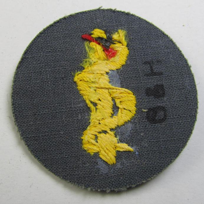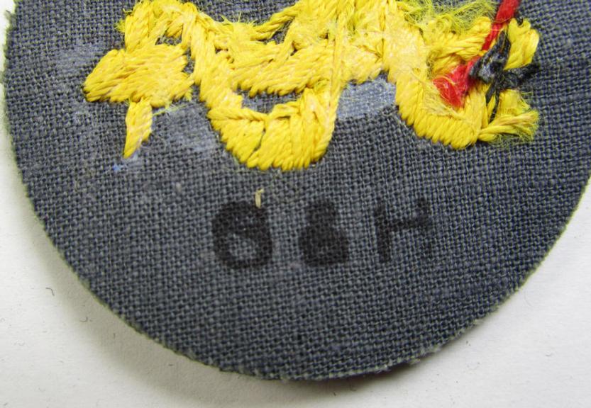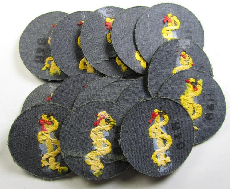 I recently found a small bundle holding 15 fully identical patches being all neatly hand-embroidered examples which are executed in bright-yellow- (ie. red and/or black-) coloured linnen on a dark-green-coloured- (and/or smooth woolen-based-) background. All examples are nicely maker- (ie. 'G &H'-) marked on the (neatly reinforced!) backings and all show some minor age ie. minimal staining caused by decades of storage only (see pictures). The pieces have simply never been used and can easily be graded 'mint-/unissued'. As stated above do all 15 insignia-pieces show an additional- ie. 'double'- backing as executed in greyish-blue-coloured linnen. The price is naturally intended per single piece.