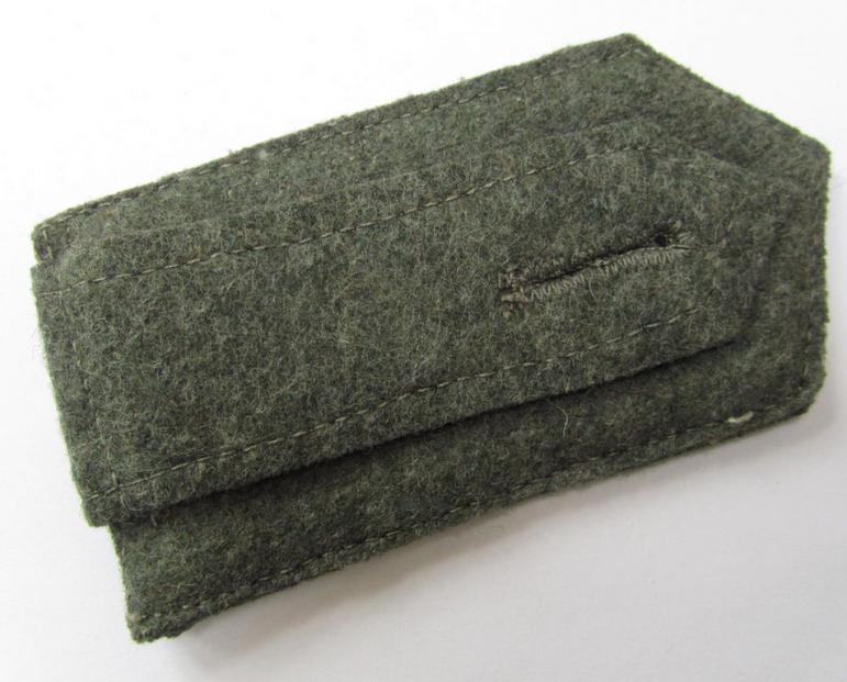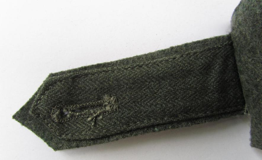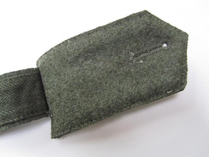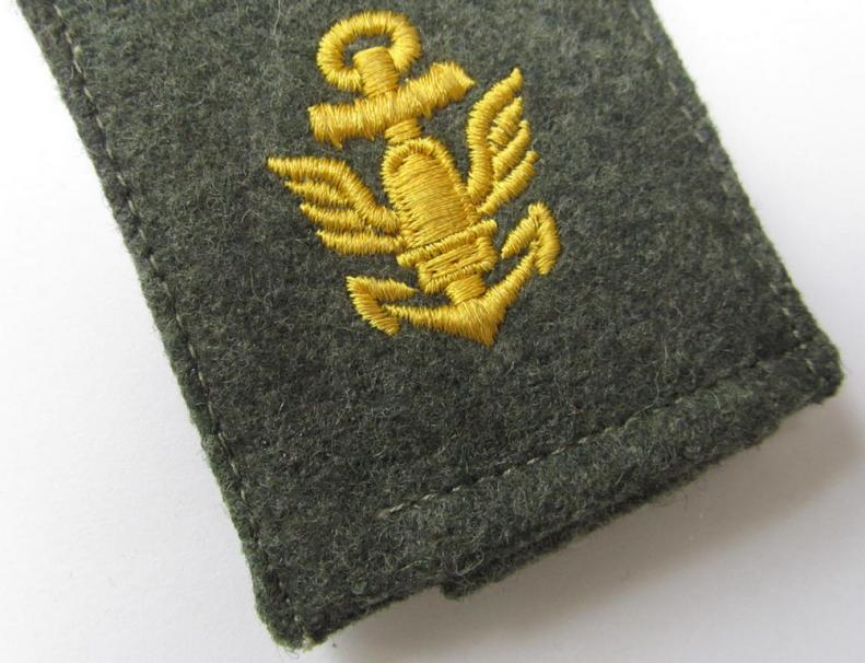 This is a truly attractive - albeit regrettably single - 'cyphered'- (and IMO mid-war-period pattern-) enlisted-mens'-type shoulderstrap, as was specifically intended for usage on the field-grey coloured navy-style tunics by a: 'Soldat eines Küsten-Artillerie-Regiments' (or soldier within a coastal-artillery unit), in overall nice (albeit IMO slightly used ie. worn-) condition. The board - which is fully 'text-book' in all facets and measures approximately 11 cms. in length (and has a width of 5,7 cms. as usually seen) has a field-grey-coloured- and/or woolen-based 'upperdeck' and comes mounted on its functional (somewhat smaller-sized-) tongue. The board shows the neat interwoven 'winged shell'-cypher (as executed in golden-yellow-coloured linnen) denoting the rank of simple: 'Soldat'. The strap - shows some minimal age and/or wear (see pictures). It should be noted that ALL 'Küstenartillerie' insignia-pieces are actually quite hard to encounter: those 'cyphered' examples even more so, which grades them easily as 'scarce'. Simply a truly attractive 'cyphered' naval EM-type shoulderstrap that was intended for usage on the field-grey-coloured attire: too bad it is only a single example!