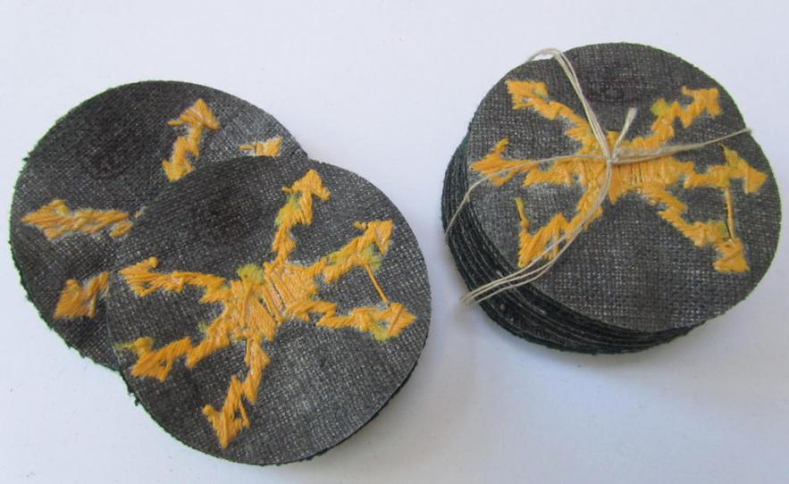 I recently uncovered a small stack holding 10 identical examples of the WH (Heeres) so-called: trade- and/or special career arm-insignia (or: 'Laufbahn- o. Tätigkeitsabzeichen'), as was intended for usage by an army: 'Funkmeister' (or: radio-operator ie. radio-equipment NCO), all ten pieces in an overall very nice- (IMO never worn- nor tunic-attached-) condition. The neat patches - which were 'off-factory-packed' as such - are all identically executed on a darker-green-coloured- and/or woolen-based background and show (detailed and/or neatly hand-embroidered-) 'arrow'-signs as executed in bright-yellow-coloured linnen (see pictures). The neatly maker-marked patches (showing a blue-coloured ink-stamp) are nicely backed with greyish-blue-coloured linnen as more often encountered. The patches show some minimal staining- ie. wrinkled appearance simply caused by decades of storage only. The price is naturally intended for one single piece. Simply a nice occasion to acquire an attractive WH (Heeres) trade-/specialist badge for a competitive price!