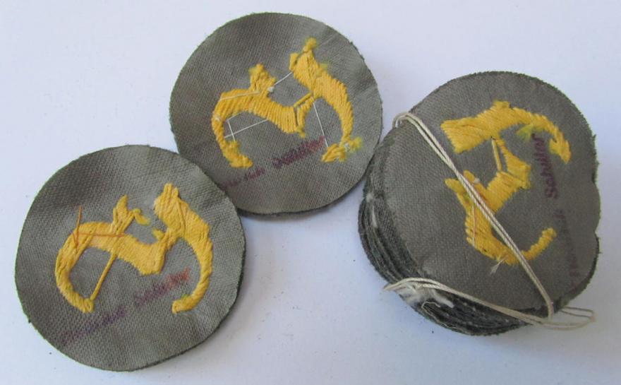 I recently uncovered a small stack holding 10 identical examples of the WH (Heeres) so-called: trade- and/or special career arm-insignia (or: 'Laufbahn- o. Tätigkeitsabzeichen'), as was intended for usage by an army: army: 'Feuerwerker' (or: artician NCO), all ten pieces in an overall very nice- (IMO never worn- nor tunic-attached-) condition. The neat patches - which were 'off-factory-packed' as such - are all identically executed on a field-grey-coloured- and/or woolen-based background and show a (detailed and/or neatly hand-embroidered-) 'F'-character as executed in bright-yellow-coloured linnen (see pictures). The neatly maker-marked patches (showing a blue-coloured ink-stamp) are nicely backed with greyish-blue-coloured linnen as more often encountered. The patches show some minimal staining- ie. wrinkled appearance simply caused by decades of storage only. The price is naturally intended for one single piece. Simply a nice occasion to acquire an attractive WH (Heeres) trade-/specialist badge for a competitive price!