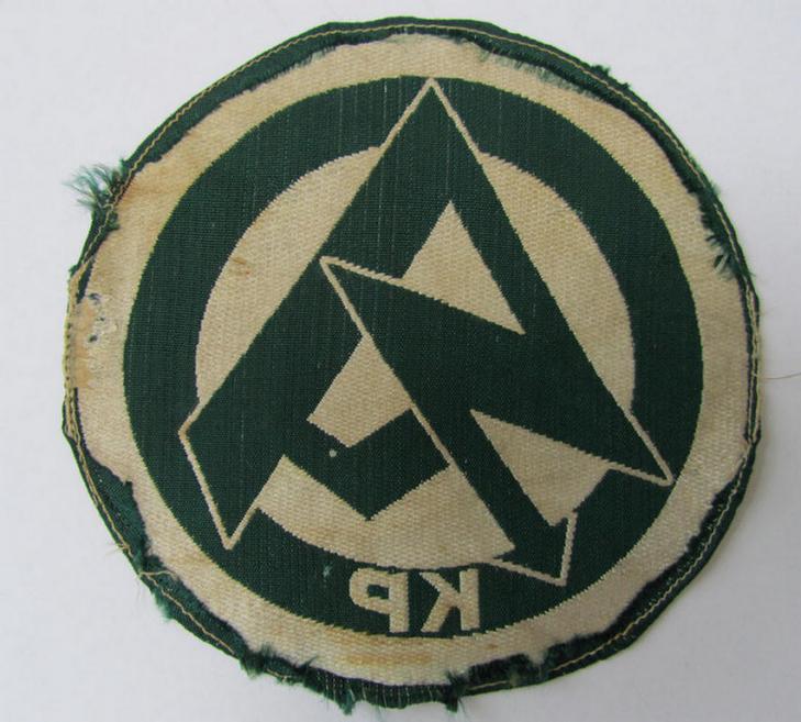 This is a very decorative - and truly scarcely encountered! - SA (ie. 'Sturmabteilungen') 'BeVo'-woven sport-shirt insignia (of the third ie. final type) as was intended for - and worn by! - a member within the: 'Gruppe Kurpfalz' (KP), that comes in overall very nice (albeit IMO moderately used ie. once shirt-removed-) condition. The fairly large-sized- badge (having a diameter of approx. 14 cms.) is IMO shirt-removed: some minimal stitching-remains are still present and or visible. The piece - which is woven in darker-green on a white-coloured background (being as stated the branchcolour of the province: 'Kurpfalz') shows some minor staining (nothing shocking though). This particular example misses its so-called: 'RzM'-etiket but does show some minimal remains wher it once was attached (see pictures). Simply a very attractive and unusually encountered piece of SA-related sport-shirt insignia!