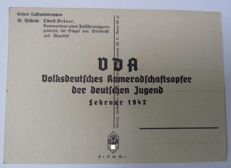 This is an attractive, period- and/or colourfull, so-called: 'Willrich'-type-, picture-postcard originating from the famous & decorative series: 'Unsere Luftlandetruppen', depicting the 'Fallschirmjäger u. Oberst' Bräuer, being an unissued example that comes in a virtually mint, condition. The postcard comes in an unissued condition and is void of any writing or text: it shows however minimal staining caused by decades of storage only. The card bears an additionally printed so-called: 'VDA'- (ie. 'Volksdeutsches Kameradschaftsopfer der Deutsche Jugend'-) text and is dated: '1942' (as is not unusual). Simply a neat and very decorative period FJ-related postcard that is IMO accordinly priced!
