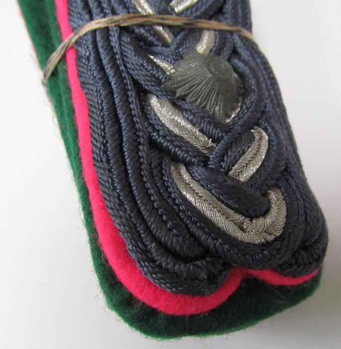 The attractive - and actually scarcely encountered! - LW-related shoulderboard-pair - which was intended for usage by a medium-ranked NCO having the comparable rank of: 'Oberfeldwebel' (or: sergeant first-class) - is constructed from the specific, greenish-coloured- and/or: smooth-like- (ie. moleskin-type-) wool and does have the (typical-) bluish-grey- and/or: silver-coloured (twisted) upperdecks as per regulation (see pictures). The boards - which can easily be graded virtually mint- ie. unissued! - have four (identical- and or zinc-based-) pips period attached denoting the NCOs rank of: 'Beambter des mittleren Dienstes im Oberfeldwebels-rang'. The boards also show the bright-pink- (ie. 'rosaroter'-) coloured 'Zwischenfarbe' (or: secondary branchcolour) attached, denoting the soldiers- ie. NCOs specific function- and/or tasking. The boards came mounted on their functional (small-sized-) tongues attached and were simply never worn and came still tied together (see pictures). The shoulderboard-pair originated from the left-overs of a stock of an old tailor-shop in Germany and was never before in a collection: the boards were simply never worn nor used (they do show some truly minimal age and/or staining caused by decades of storage only, as can be seen on the pictures). It should be noted that these Luftwaffe-related-, NCO-type shoulderboards as were intended for medium-ranked administrative-officials ie. 'Beambter des mittleren Dienstes im Oberfeldwebelsrang' can easily be graded: 'fairly scarce'. Only the first such neat pair having the bright-pink- (ie. 'rosaroter'-) coloured secondary branchcolour I did ever had on offer!