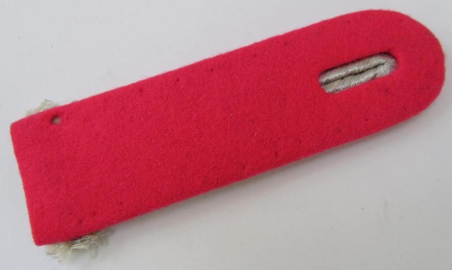 This is an attractive - albeit regrettably single! - neatly 'cyphered'-, WH (Heeres) ('dress'-type) officers'-type shoulderboard, as was piped in the bright-pink- (ie. 'rosaroter'-) coloured branchcolour, as was intended for a: 'Leutnant des Panzerjäger-Abteilungs 17' (or lieutnant who served within the anti-tank ie. tank-destroyer unit, numbered: '17'), that comes in an overall very nice (and IMO never worn nor tunic-attached-, condition. The neat shoulderboard - which is actually hard to encounter and can IMO easily be graded 'scarce' - is constructed in the smooth-type (ie. 'moleskin'-like) wool and is per regulation piped in the (very!) bright-pink- (ie. 'rosaroter'-) coloured branchcolour. The board - which has a length of approximately 11,7 cms. - comes without tongue as found and was thus a board that was intended to be used as a so-called: 'sew-in'-type example. The board has a neat bright 'silver'-coloured (ie. 'shiny'-) 'upperdeck' (something that clearly identifies it as WH Heeres-type shoulderboard that was intended for usage on a 'dress'-type army-tunic ie. 'Waffenrock'). The board shows some minimal age ie. staining caused by years of storage only (as can be seen on the pictures). The board - which originates from a private household and was never before part of a collection - was found together with the similar-styled board that I offer under #40533: both belonged to the same officer. This example shows a (smaller-sized-) golden-toned-, Gothic-styled- so-called: 'P'-cypher and/or: '1' and/or '7'-numerals period-attached: all three devices show some minimal tarnish ie. wear but are very nicely preserved. Of additional interest is moreover the fact that the 'cyphers' were attached BEFORE the board was assembled (something that is not always the case). Simply an attractive - and desirable! - shoulderboard that belonged to a: 'Leutnant des Panzerjäger-Abteilungs 17': too bad that it is only a single example!