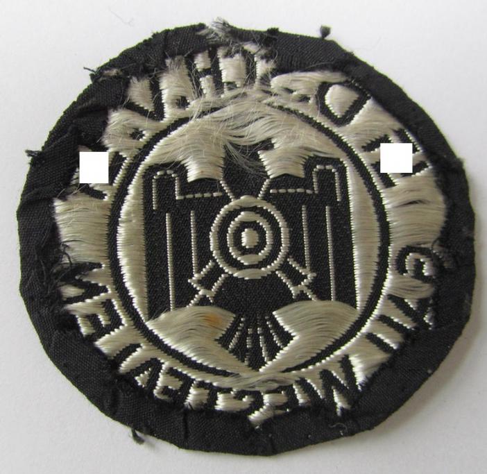 This is a truly attractive - and with certainty rarely encountered! - linnen-based-, so-called: 'Auszeichnung für Schiessleistungen des Deutscher Schützen- verbandes Gau Westfalen' (ie. DSV), being an example as was executed in so-called: 'BeVo'-weave-pattern, that comes in an overall nice (ie. moderately worn- ie. confectioned-), condition. The patch (which measures 6,8 x 6 cms.) was IMO once worn and/or issued (I deem that it was once even tunic-attached). It only shows some minimal aging caused by regular usage and/or wear (but it is totally undamaged). The neat piece - that shows the 'DSV'-symbol surrounded by text and showing two swastikas - is executed in silverish-white-coloured linnen on a black-coloured- (and/or linnen-based-) background. Regrettably, could I not find any in-deth reference-material regarding this (with certainty) rarely encountered 'DSV'-shooting-award: I deem that it is accordingly priced!