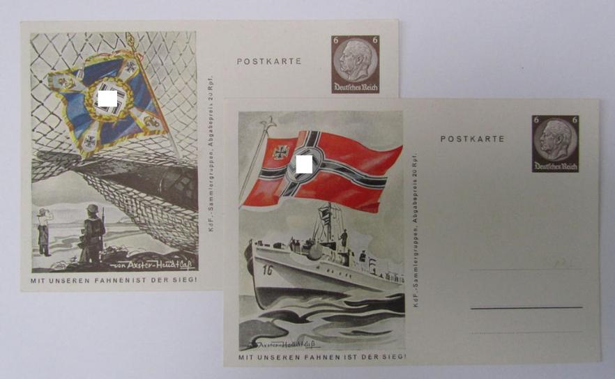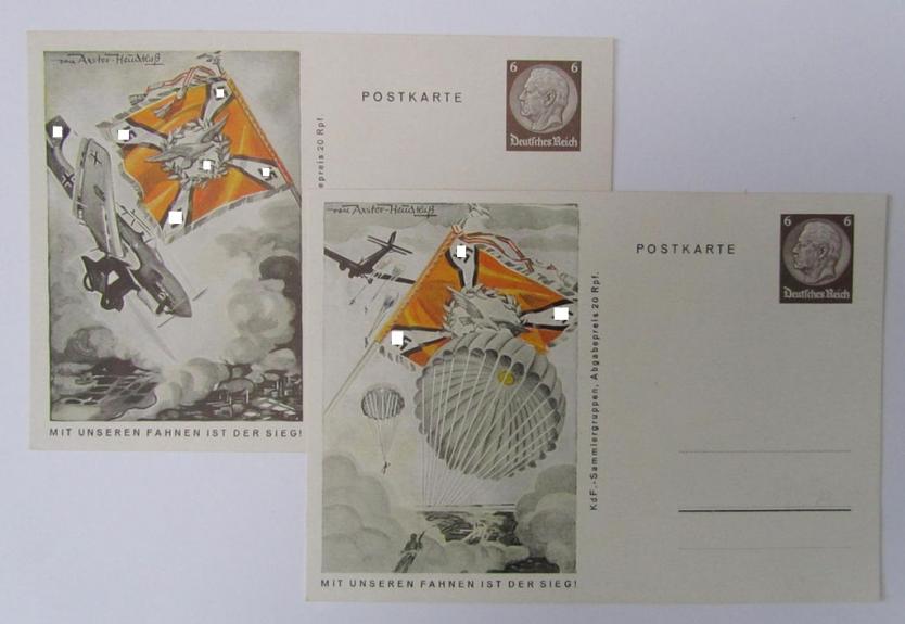 This is an attractive - and actually scarcely seen! - 8-pieced set, comprising of eight, colourfull- and/or period postcards originating from the famous: 'Mit unseren Fahhen ist der Sieg!'-series, that all eight come in an overall very nice (and never sent- nor used-), condition. The attractive series: 'Mit unseren Fahhen ist der Sieg!'-series was (IMO) published around 1941/42 and was published in the framework of the: 'KdF' (ie. 'Kraft durch Freude'-) organisation. The decorative cards - which are all sized 14 x 9,5 cms. as usual - come in an unissued condition and originate from an old postcard-collection as was period-compiled: they are all void of any writing but do show some minimal staining and/or age. The set includes the cards of respectively the: 'Flieger-Truppen', 'Schnelle-Truppen', 'Pionier-Truppen', 'Kriegsmarine', 'Nebelwerfer-Truppen', 'LW Flakartillerie-Truppen', 'Fallschirmjäger-Truppen' and 'KM Küstenartillerie-Truppen' and shows the 'Fahnen' (or regimental flags) of these troops nicely displayed (as can be seen on the pictures). All cards show an integrated postage-stamp with a value of '6 Reichspfennig' and were as such ready to be sent when acquired in the period). Simply an attractive, period postcard grouping that is IMO accordingly priced and would look great if properly framed together!