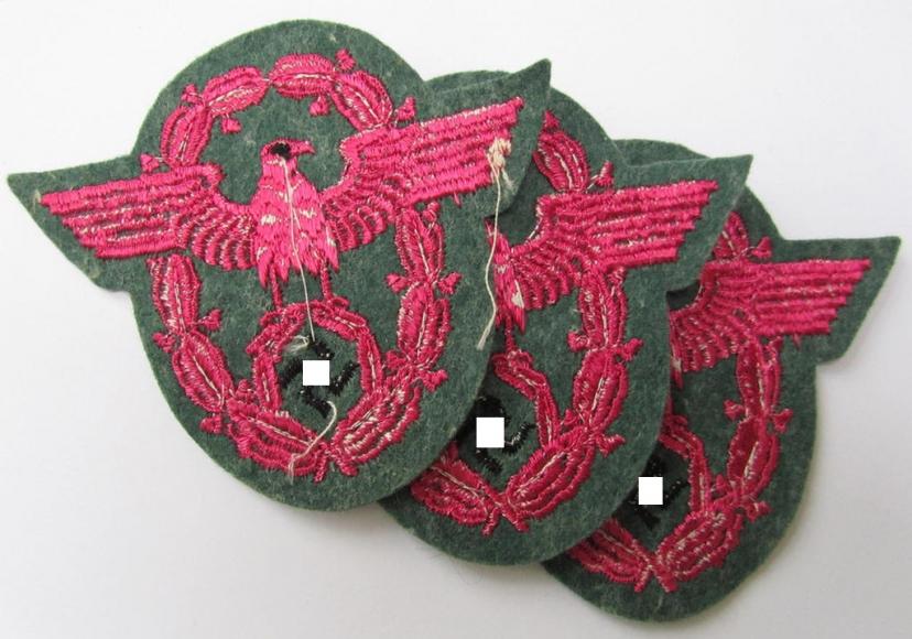 I recently uncovered three - fully identical and actually not that easily found! - examples of the police- (ie. 'Polizei'- or: 'Feuerwehr'-) related arm-eagles (ie. 'Ärmeladler') as was intended for usage by the staff of the: 'Feuerlöschpolizei' (or: specific police-related fire-brigades) that all three come in an overall very nice (ie. virtually mint-/unissued- and/or never tunic-attached-), condition. The pieces are executed in bright-pink-coloured linnen and come mounted on a piece of field-grey- (ie. typical 'police-green'-) coloured wool as to be expected (see pictures). These neat arm-eagles were specifically designed for usage by the staff of the: 'Feuerlöschpolizei'-units and saw wide-spread usage throughout the war. The eagles on offer here show great pronounced detail and come in a great (ie. minty and/or never tunic-attached-) condition: they were never worn nor tunic-attached and are void of an additional 'backing' as is more often seen (as can be seen on the pictures). The asking-price is naturally intended for one single arm-eagle. Simply a great occasion to acquire a 'Feuerlöschpolizei'-related 'Ärmeladler' for a competitive price!