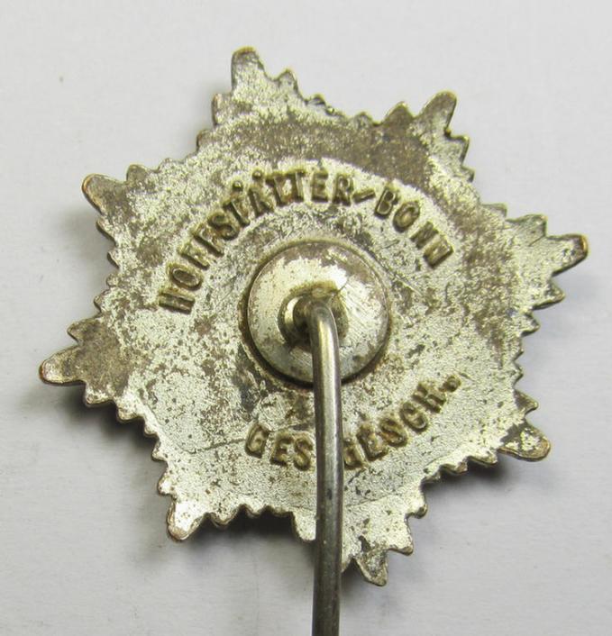 This is an attractive example of a first pattern- and semi-enamelled RLB- (ie. 'Reichluftschützbund') so-called: 'Zivilabzeichen' (or: civil-attire badge) bearing a clearly present makers'-mark (that reads: 'Hoffstätter - Bonn') and patent-pending- (ie. 'Ges.Gesch.'-) marking on its back and that comes in an overall nice- (albeit used- ie. worn-), condition. The piece has stunning (and totally undamaged!) blue-coloured enamel and comes mounted on its original and functional long-sized pin (as can be seen on the pictures). The piece has most certainly never been cleaned nor polished and is a tiny bit stained ie. tarnished. A similar badge is also figured in the 'Heering-Hüsken' lapel-pin catalogue, werein it is given the unique reference number: '5909A'. Simply an attractive and desirable 'RLB'-related item: hard to encounter a nicer example for a more interesting price!