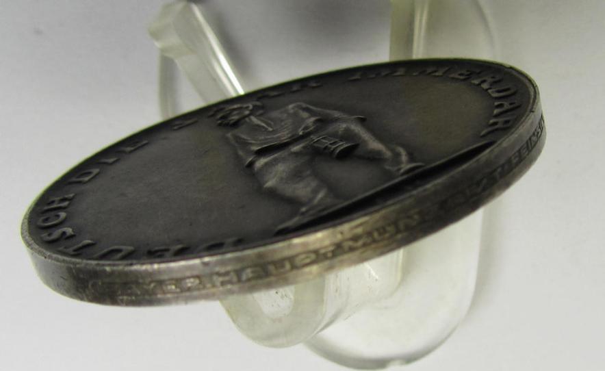 This is an attractive - and with certainty not that often- ie. scarcely encountered! - silver-toned- (and genuine silver-based!) so-called: commemorative-plaque (ie. 'Erinnerungs- o. nichttragbare Medaille') a (detailed) map of the Saarland and bearing the text: 'Volksabstimmung im Saargebiet - 13.1.1935' on its front and on its back the text: 'Deutsch die Saar immer Dar' and showing an illustration of a farmer (or mining-official) and that comes in an overall wonderful and nicely preserved, condition. The neat - medium-sized- and/or regular-weight-piece having an approximate diameter of 3,7 cms. - has truly pronounced detail and was IMO never cleaned nor polished: it has maintained a neat silver-toned age-patina (but also shows some minimal tarnish - see pictures). The piece is void of a silver-content-mark but shows a clear makers'-designation on the rim (that reads: 'Hauptmünzamt - Feinsilber'). These neat - semi-official - presentation-pieces were IMO used as some sort of awards as (presumably) handed-out at party-related gatherings or alike. The piece originates from a private household in Germany where it was recently uncovered as issued and stored for decades (see pictures). Simply a very attractive and with certainty unusually encountered table-medal ie. 'Erinnerungs- o. nichttragbare Medaille' that might merit some further investigative work!