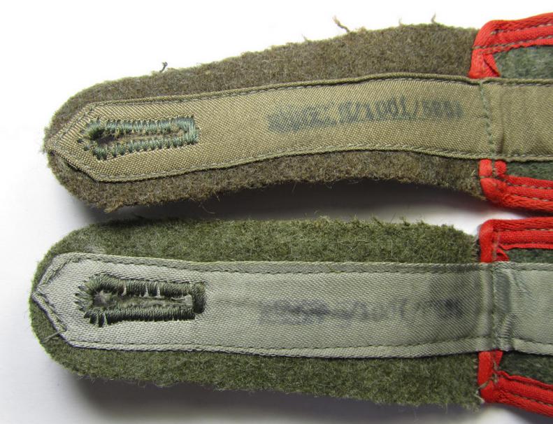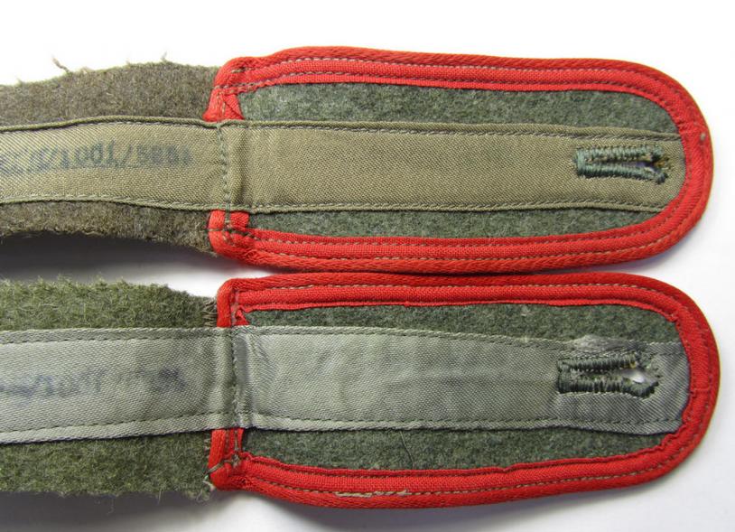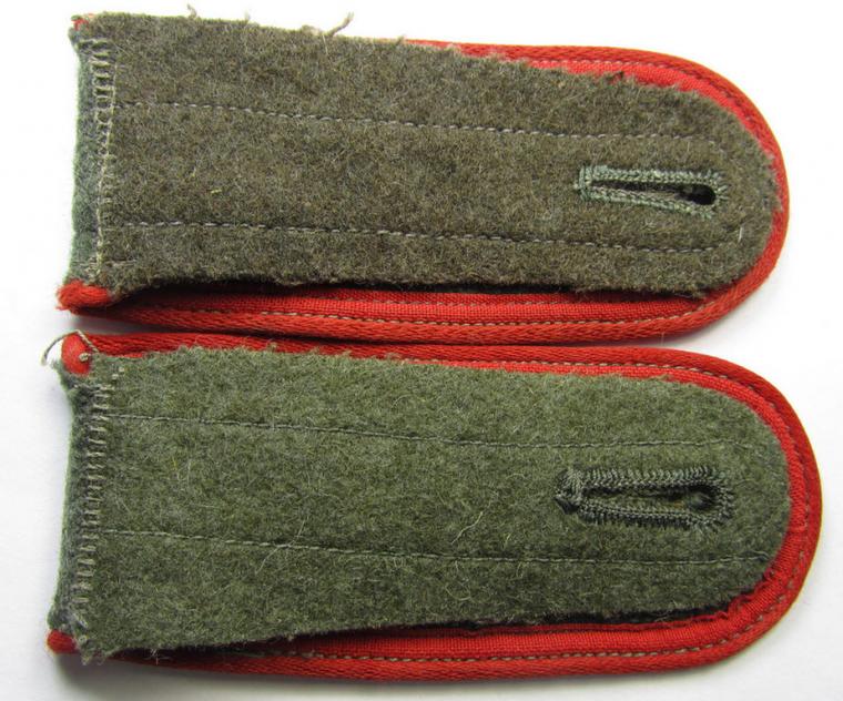 Matching pair of later-war-period-, so-called: 'M44'-pattern-, simplified WH (Heeres) enlisted-mens'-type shoulderstraps, as piped in the bright-red-coloured branchcolour as was intended for usage by a: 'Soldat der (Sturm)Artillerie-Truppen'