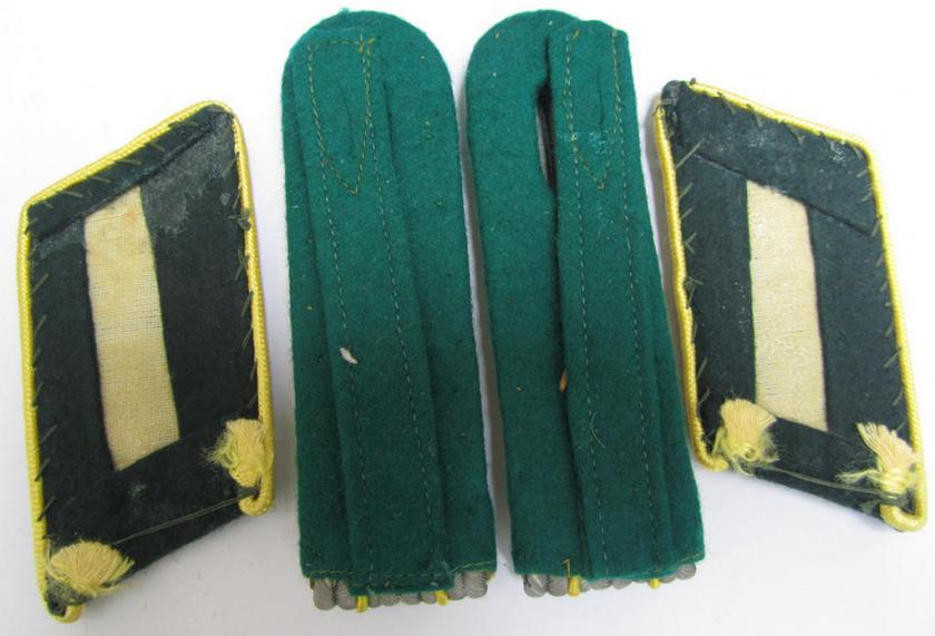 This is a truly very attractive - and with certainty rarely encountered! - four-pieced insignia-grouping comprising of a (matching) pair of specific 'cyphered', officers-type shoulderboards (ie. 'Schulterstücke') and dito collartabs (ie. 'Kragenspiegel') as was intended for - and clearly used by! - a WH (Heeres) 'Heeresfeldpostinspektor' (being of a rank comparable with an: 'Oberleutnant'-rank) and that comes in an overall very nice- (albeit worn- ie. carefully tunic-removed-), condition. The boards - which have an approximate length of 11,3 cms. - are executed in the 'smooth'-like- and/or (typical) darker-green-coloured wool (aka moleskin'-wool). They have the have the neat (bright- ie. lemon-yellow- or: 'zitronengelber'-coloured-) branchcolour and typical silver-greyish-coloured 'upperdecks' (showing an (interwoven) equally bright-yellow-coloured 'stripe' something that was obligatory for all shoulderboards as worn and/or used by the various 'Feldpost'-service-officials). The boards - which were worn on the 'standard'-type, field-grey-coloured 'Heeres'-tunics - have identical, bright-golden-coloured (ie. I deem 'Buntmetall'-based) 'FP'-cyphers and two (equally bright-golden-coloured) pips, period-attached. The pair comes mounted onto its functional, typically thin-shaped officers'-type tongues attached (as can be seen on the pictures). The pair was - I deem - only minimally used and shows as stated above only moderate wear and/or age. The shoulderboard-pair came with a (also matching) pair of neatly hand-embroidered, officers-type 'Feldpost'-collartabs (ie. 'Kragenspiegel'). These have the (bright- ie. lemon-yellow- or: 'zitronengelber'-coloured) branchcolour and are also 'piped' with this 'zitronengelber'-coloured (and rayon-based) branchcolour (as per regulation). This rarely seen insignia-grouping originates from a larger shoulderboard- and/or insignia-collection I recently acquired and was most certainly worn as such: the field-post official who wore the set always kept it as a souvenir. Simply a very attractive - and actually rarely encountered! - set of 'Fieldpost'-insignia: x-time more rarer encountered than a 'regular' pair of WH 'Oberleutnant'-related insignia!