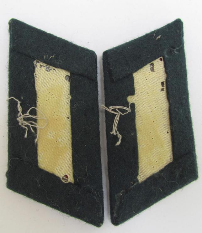 The attractive collar-tabs were clearly used ie. once tunic-attached and some of the stitching-remains- (ie. holes) are still present and/or visible (as can be seen on the pictures). The collar-tabs - which have the dark-green coloured- and/or truly smooth-woolen-based backgrounds and/or bright-red- (ie. 'hochroter') branchcolour as to be expected - show great pronounced detail: especially the silver-coloured embroidery is simply stunning and/or very pronounced. The tabs are nicely 'backed' with beige-yellow-coloured- and/or 'buckram'-based material as is more often encountered (see pictures). Simply an attractive pair that will be very hard to be upgraded and that is IMO accordingly priced!