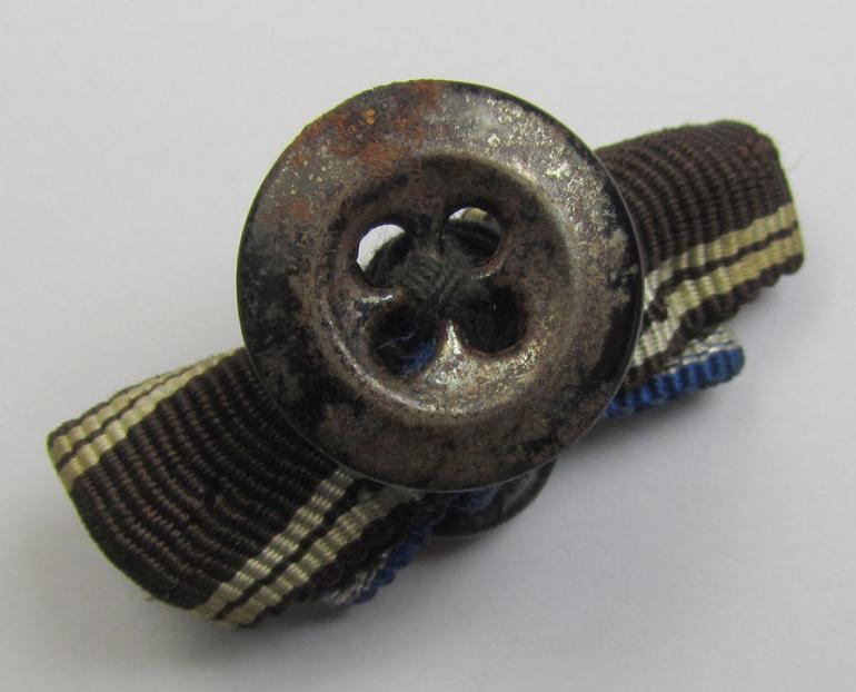 This is an attractive - and actually quite scarcely encountered! - example of a 2-pieced, WWII-period ribbon-bar (ie. 'Feld-/Bandspange') that comes on its specific 'button-hole'-set-up, showing respectively the ribbons for two: 'N.S.D.A.P.-Dienstauszeichnungen der 2. u. 3. Stufe' (or: N.S.D.A.P. loyal-service medals for respectively 10 ie. 15 years of loyal service) having its detailed (and silver-coloured) miniature-device attached and that comes in an overall very nice (albeit IMO used and/or minimally worn-), condition. The - very detailed! - (eagle-) devices has a neat and/or minimally 'frosted' albeit very detailed appearance: it retains a nice and/or bright-coloured age-patina. The piece is naturally fully functional and comes on its functional specific 'button-hole'-set-up (as is more often observed). Simply a very nice 'N.S.D.A.P.-related 'Feld-/Bandspange' that is not often offered for sale: ideal to upgrade or decorate any N.S.D.A.P.- and/or party-related tunic!