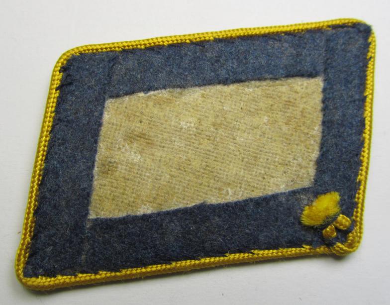 This is an attractive - and actually scarcely seen! - example of a - regrettably single albeit nicely preserved! - IMO enlisted-mens'- ie. NCO-type, so-called: 'N.S.F.K.'- (or: 'National-Socialistisches Fliegerkorps'-) collar-tab (ie. 'Kragenspiegel für Mannschaften u. Unteroffiziere') that comes in an overall very nice- (and IMO never worn- nor used- ie. virtually mint- ie. unissued-, condition. The tab shows the golden-yellow- (ie. 'goldgelbener'-) coloured (and rayon-based) branchcolour ie. piping (as to be expected). The tab - which is constructed from typical LW-coloured cloth ie. wool - does show some truly minimal staining ie. age (see pictures) and is nicely 'backed' with 'buckram'-based material as is more often encountered. It should be noted that all 'N.S.F.K.'- (or: 'National-Socialistisches Fliegerkorps'-) rank-insignia can easily be graded 'very scarce' and are not that often offered for sale: too bad that it is only a single example!