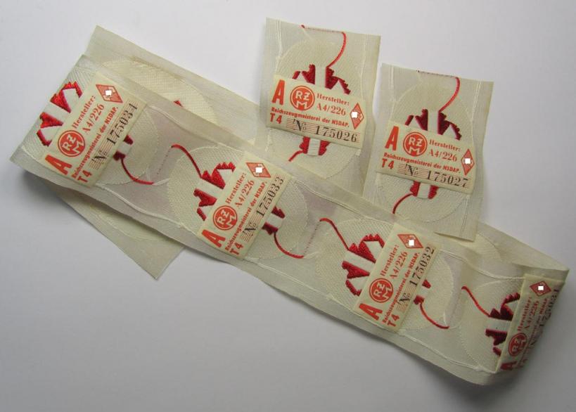 I recently uncovered a period 'strip' holding 10 HJ/BDM (ie. 'Hitlerjugend'/'Bund Deutscher Mädel') so-called: trade- or specialist armbadges as all executed in neat 'BeVo'-weave pattern, as intended for usage by a: 'Feldscher' (or: medical orderly) still retaining their (consecutive!) RzM-etikets, all ten pieces coming in an overall very nice- (ie. 'virtually mint'- and/or never tunic- ie. shirt-attached-), condition. The neat badges - all sized: 6,5 x 5,5 cms. - come as 'straightly cut from the role' and were never folded nor confectioned. They can, however, easily be mounted onto a tunic or shirt if wished so. All ten (identical) pieces show their (consecutive!) 'RzM'-etiket in place (as can be seen on the pictures). My asking-price is naturally intended per single piece. Simply a nice occasion to acquire a neat - and fairly unusally encountered! - HJ/BDM cloth-based speciality-patch that will be impossibly to be upgraded!