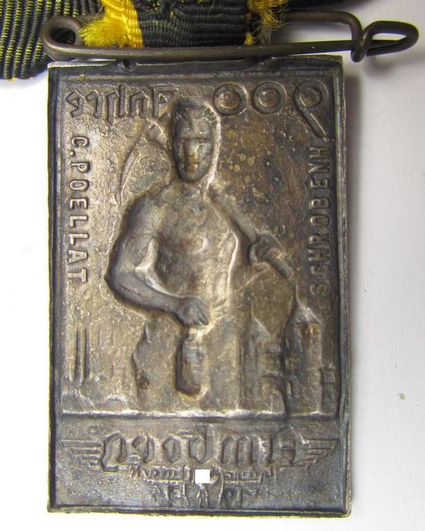 The neat commemorative, silverish-coloured- and/or: 'Buntmetall'-based, 'Veranstaltungsabzeichen' (ie. 'tinnie') on offer here comes in the format of a tiny portable 'medal': it is neatly maker- (ie. 'Carl Poellath'-) marked on its back and comes mounted on its (black- and yellow-coloured) ribbon as issued and/or worn. It shows an illustration of a worker carrying a scimmitar and shows a tiny swastika-sign and text that reads: '900 Jahre Amberg - Bayr. Ostmark - 1934'. The detailed badge (ie. 'tinnie' or: 'Veranstaltungsabzeichen') is executed in (fairly high-quality) 'Buntmetall'-based metal and shows some wear and/or moderate age (but has IMO not been cleaned nor polished). The badge comes mounted on its period-attached ribbon that shows a safety-pin attached (as can be seen on the pictures). The piece shows a clearly present makers'-designation on its back that reads: 'C. Poellath - Schrobenhausen'. Simply an attractive 'Veranstaltungsabzeichen' (ie. 'tinnie') that is IMO accordingly priced!