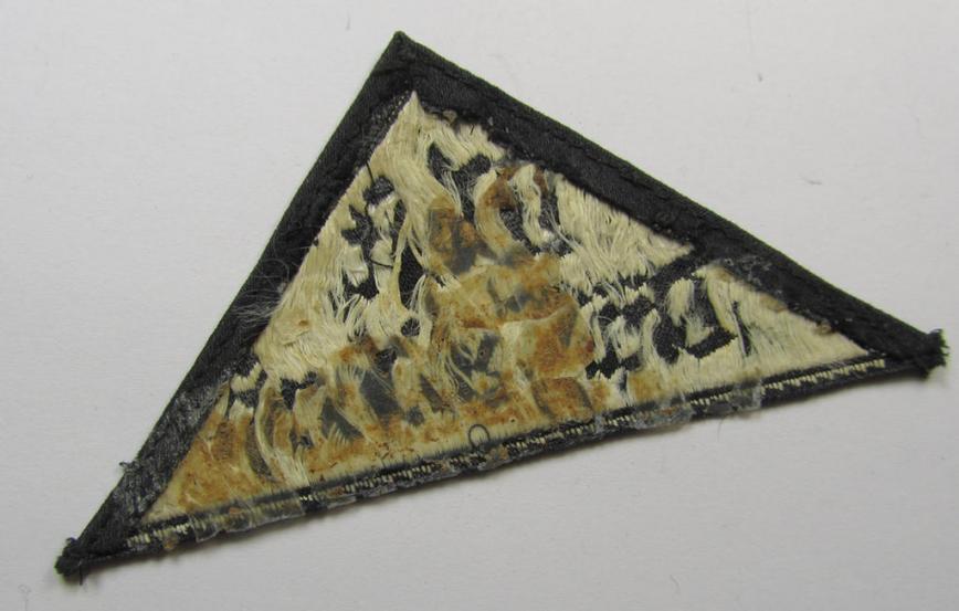 This is a 'female'-specimen, indicating that it is neatly woven in silver-white-coloured linnen on a black-coloured (and also linnen-based-) background. This example was probably issued and/or minimally used- ie. tunic-attached but has lost its 'RzM-etiket' over the years: it has IMO once been glued into an album or scrapbook and shows some glue-remains on its back (as can be seen on the pictures). The piece just shows some minimal staining caused by moderate wear and/or decades of storage (as can be seen on the pictures). It should be mentioned that this is one of the more scarcely seen 'BDM-Gebietsdreiecke' within the extensive series. Simply a very attractive, female-type 'BDM'- (ie. 'Bund Deutscher Mädel') district-triangle that is IMO accordingly priced!