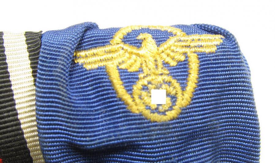 This is an attractive - and in this uncommonly found combination not that often seen! - two-pieced medal-bar (ie. 'Doppelspange') respectively depicting a WWI-period: 'Frontkämpferkreuz 1914-18' (ie.: 'Kriegsteilnehmerkreuz mit Schwerter') and a neatly silvered: 'Polizei-Dienstauszeichnung 1. Stufe' (or police loyal-service medal first class as was awarded for 25 years of loyal service within the various police-services) both pieces coming in an overall very nice- (albeit minimally used- ie. worn-), condition. Both awards are truly golden-bronze- (ie. bright-golden-) coloured and 'fairly frosted' examples that are just minimally tarnished by age and/or moderate usage and wear (as can be seen on the pictures) but are void of any damage or alike. Both pieces come naturally mounted on their period ribbons and have a nicely preserved age-patina and are just a tiny bit dirty: they were IMO never cleaned nor polished (see pictures). The entire 'Spange' is nicely 'backed' with a piece of greenish-coloured wool and shows a (regular-type- and functional) pin- ie. catch-set-up (as can be seen on the pictures). The 'Spange' shows a neatly interwoven 'Polizei'-eagle-device on its blue-coloured ribbon (done in golden-yellow-coloured linnen as to be expected). The 'Frontkämpferkreuz 1914-18' is a non-maker-marked example. Simply an attractive example of a two-pieced 'Polizei'-related 'Ordenspange' in an uncommonly found combination that will hard to be upgraded!