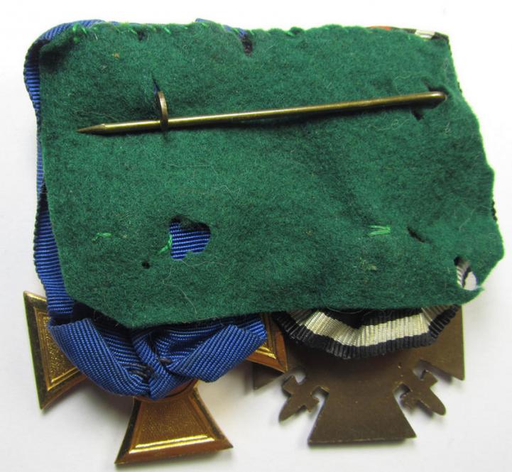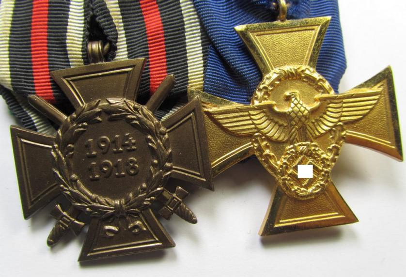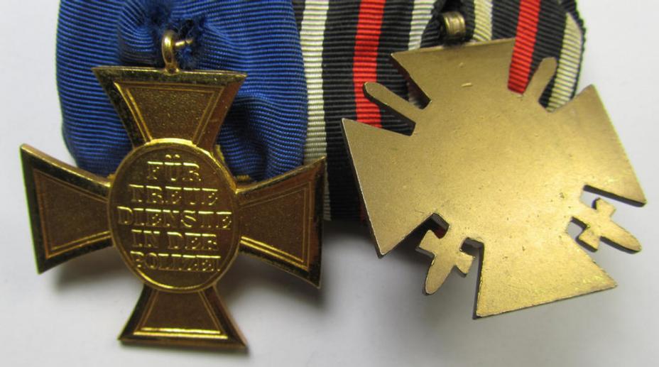 Two-pieced medal-bar (ie. 'Doppelspange') respectively depicting a WWI-period: 'Frontkämpferkreuz 1914-18' (ie.: 'Kriegsteilnehmerkreuz mit Schwerter') and a detailed: 'Polizei-Dienstauszeichnung 1. Stufe'