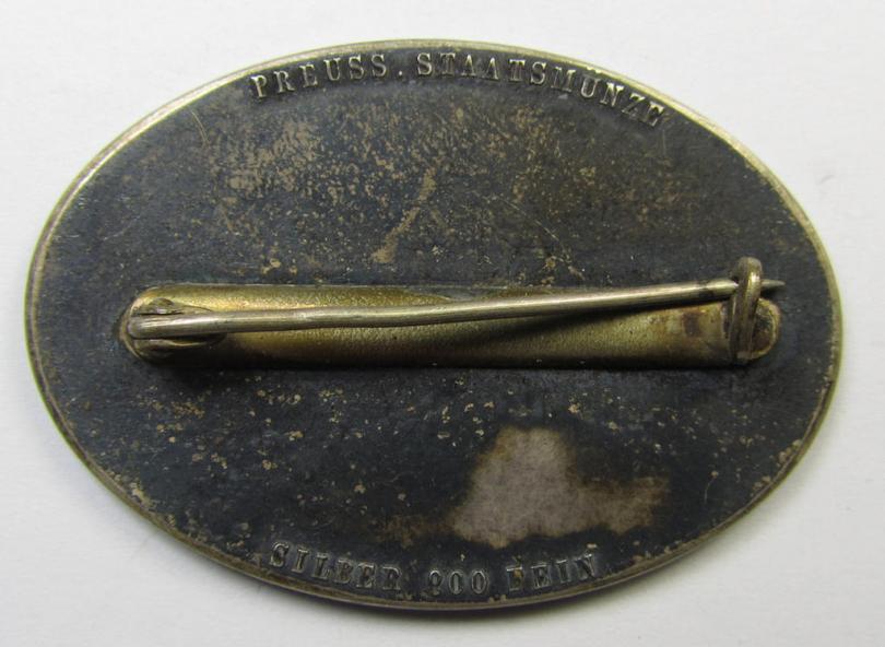 This is a truly attractive - and actually quite rarely seen! - example of a pre-war-period- and/or genuine silver-based (ie. '900'-stamped), so-called: 'Erinnerungszeichen Verdienste um das Feuerlöschwesen 1934' being a very detailed- and maker- (ie. 'Preuss. Staatsmünze'-) marked example that comes stored in its (actually rarely seen!) period etui and that comes in a wonderful- (ie. very nicely preserved-) condition. The oval-shaped piece - having an approximate height of 4,3 cms. - shows a burning house, fire-worker- and/or swastika-sign and comes mounted on its (functional) pin-/catch-set-up (as can be seen on the pictures). It has a very nice (ie. somewhat darkened) age-patina and has with certainty never been cleaned nor polished: it comes as recently found at a private-household in Germany. The piece - which shows a clearly present makers'-mark ie. logo (as mentioned above) - shows nice and/or pronounced detail but also shows the obvious signs of having been moderately worn (it is still a bit dusty as found and comes as stored for decades). The two-pieced (and burgundy-red-coloured) etui (which is sized: 5,5 x 5,3 x 1,4 cms.) is void of any makers'-designation and comes in an equally nicely preserved condition (as can be seen on the pictures). Simply an attractive - and complete! - example of the: 'Erinnerungszeichen Verdienste um das Feuerlöschwesen 1934' that is - I deem - priced according to its rarity and/or obvious desirability!