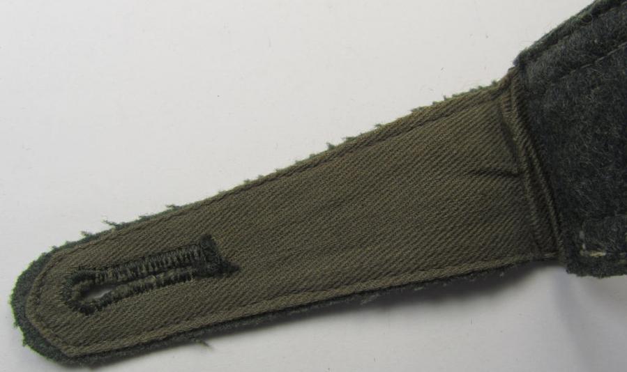 This is an attractive - albeit regrettably single but nevertheless scarcely encountered - WH (Heeres), early- (ie. pre-war-) period, 'M36'-pattern- (ie. pointed-styled-) 'cyphered' and/or non-piped shoulderstrap, as was intended for usage by an: 'Unterwachtmeister des Artillerie-Regiments 63' (or: junior-sergeant who served within the artillery-regiment ie. unit numbered: '63') and that comes in an overall very nice- (albeit moderately used ie. worn-), condition. The strap - which approximately measures 11,6 cms. in length - has the 'standard'-pattern- and/or darker-green-coloured, smooth-woolen-based 'upper-deck' and has (of course) no piping (as per regulation). The shoulderstrap shows the neat (machine-embroidered by means of so-called: 'Kurbelstickerei'-) '6' and '3' numerals (see pictures). Both 'cyphers' are executed in the bright-red- (ie. 'hochroter'-) coloured wool ie. linnen as to be expected (see pictures). The strap - which comes mounted on its functional tongue and that shows the standard-pattern, silver-coloured NCO-braid - shows as stated moderate usage and/or wear (some minor staining and/or dust is however visible and/or present). It should be noted that all 'cyphered' so-called: 'Artillerie'-related shoulderstraps are very desirable and can easily be regarded 'scarce', even more so when they come in such a nicely preserved condition. In any case an attractive, early- ie. pre-war-period, 'cyphered Heeres' shoulderstrap which is IMO priced according to its obvious desirability and/or scarcity!