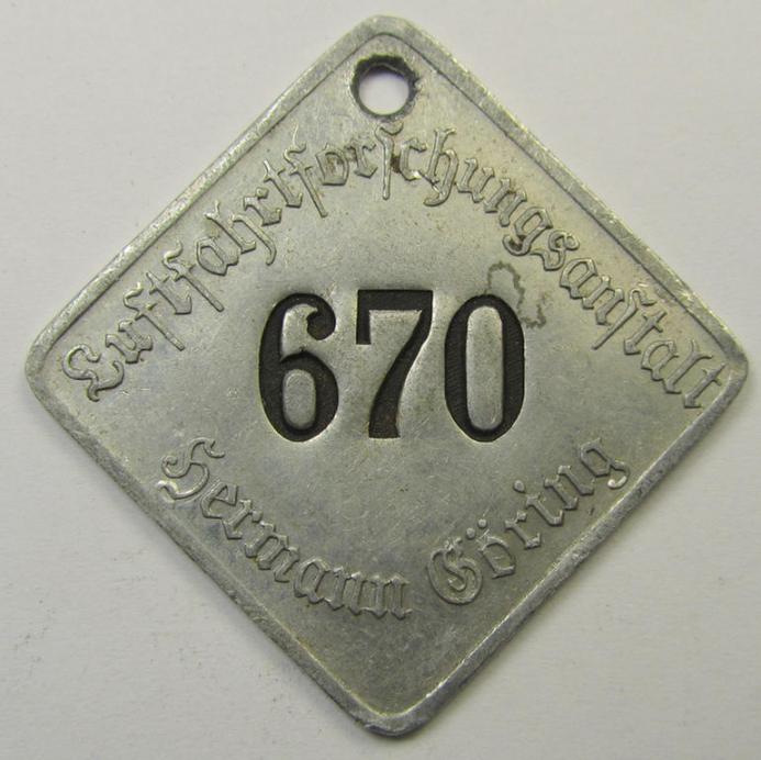 Very unusual, aluminium-based equipment- ie. wash-tag (ie. 'Wasch-Marke') bearing the unique numeral: '670' and superimposed text: 'Luftfahrtforschungsanstalt Hermann Göring'