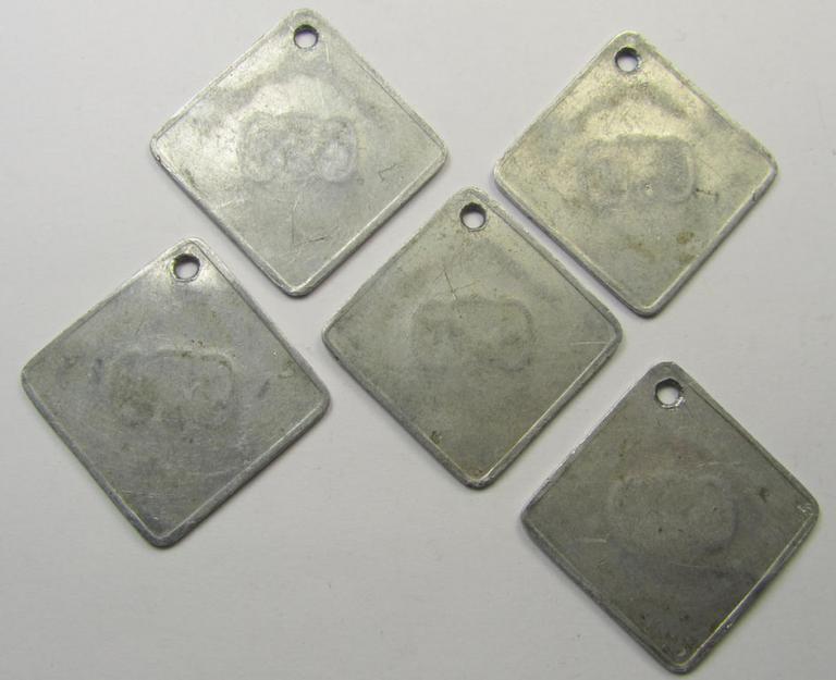 I recently found five - fully identical! - examples of the unusually seen, aluminium-based equipment- ie. wash-tags (ie. 'Wasch-Marken') all five bearing the unique numeral: '670' and superimposed text: 'Luftfahrtforschungsanstalt Hermann Göring' all five pieces coming in an overall nice- (albeit clearly used- ie. worn-), condition. These square-sized tags (sized: 3,2 x 3,2 cms.) were very popular amongst the troop for obvious reasons but did not see wide-spread usage: the five tags originate from a private household in Germany and belonged with certainty to one soldier who kept these as a souvenir of the past war for years. I decided to sell them per single tag. I deem that these interesting little equipment-items would merit further investigative work!
