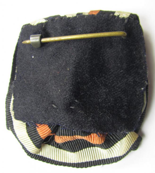 This is an attractive example of an - actually unusally seen! - copper-bronze-toned, so-called: 'Einzelspange' showing a WWI-period: 'Frontkämpferkreuz 1914-18 mit Schwerter' (ie.: 'Kriegsteilnehmerkreuz 1914-18 mit Schwerter') that has (IMO) been hardly used- nor worn. The piece is a detailed- and/or IMO zinc- ie. 'Feinzink'-based, specimen that is neatly maker-marked on its back: it bears the maker-designation: 'R.V. 45 - Pforzheim' (as can be seen on the pictures). The detail on this example is extraordinary: it has IMO never been cleaned nor polished and has an attractive and somewhat 'darkened'- (ie. tarnished) age-patina. The medal is 'mounted' onto a chromed-steel-based clasp that its 'backed' with black-coloured wool (with functional pin/catch) as was intended for wearing this example on a 'going-out'- ie. dress-tunic or 'Waffenrock'. This example retains pronounced details and has a great ie. only minimally darkened- ie. tarnished age-patina: it truly retains all of its bronze-toned finish (as can be seen on the pictures). The multi-coloured ribbon shows only minimal usage and/or staining. It should be mentioned that it is actually quite unusual to find a: 'Frontkämpferkreuz 1914-18 mit Schwerter' mounted as an: 'Einzelspange'!