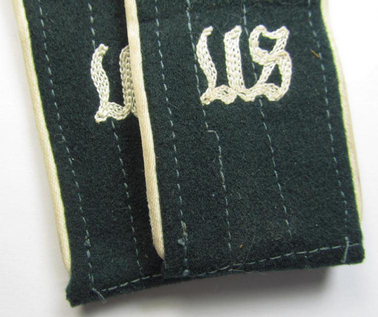 This is a truly very atttractive - and/or fully matching and with certainty rarely seen! - pair of WH (Heeres) later-war-period, simplified-pattern so-called: 'M44'-styled enlisted-mens'-type and neatly 'cyphered' shoulderstraps as piped in the white- (ie. 'weisser'-) coloured branchcolour as was intended for - and clearly used by! - a: 'Soldat der Infanterie-Truppen u. Mitglied einer Unteroffiziersschule' (or: simple soldier ie. student who served within an infantry-related junior-NCO school) and that comes in an overall very nice- (I deem hardly used- nor worn-), condition. The neat straps - which have the (unusual!) darker-green-coloured and/or woolen-based 'upperdecks' - have the neat white- (ie. 'weisser'-) coloured (and/or: 'silk-like'-type-) piping attached (as can be seen on the pictures). They each measure approximately 11 cms. in length and are fully matching in style and/or execution: they are a typical, 'standard-issue'-pair. The straps (which come mounted on their functional tongues) show the neat (carefully machine-embroidered by means of so-called: 'Kurbelstickerei'-) 'US'-cyphers (which are executed in the white- (ie. 'weisser'-) coloured wool- ie. fine-structured linnen as to be expected (as can be seen on the pictures). The pair was hardly (or even never) worn and just shows some minmal storage-age and/or staining as to be expected. This particular shoulderstrap-set originated from a larger-sized- and older cloth-/shoulderstrap-collection I recently acquired. I have a completely similarly-styled pair in my private shoulderstrap-collection and this is just the second such very interesting pair I have ever encountered. Simply a great occasion to acquire an attractive and with certainty desirable EM- ie. 'M44'-pattern, 'Infanterie'-related shoulderstrap-pair that belonged to a: 'Soldat der Infanterie-Truppen u. Mitglied einer Unteroffiziersschule'!