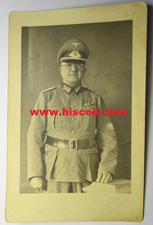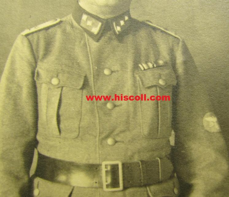 The attractive 'Postschutz'-arm-badge - which is executed in light-grey-coloured linnen on a greyish-coloured background and which is executed in the neat 'BeVo'-weave-pattern - was clearly issued and once tunic-attached: it was neatly pre-folded- and/or trimmed and comes in carefully tunic-removed condition (it still shows some minimal thread- ie. stitching-remains as can be clearly seen on the pictures). The badge - which is executed in white-coloured linnen on a light-grey-coloured and also linnen-based background is of the pattern not showing an orange-coloured border - is approximately 10 x 6 cms. sized and was as stated above clearly issued and worn (it does show some minimal staining ie. wear): it has been neatly confectioned and pre-folded. I have seen these pieces also having a bright-orange-coloured (interwoven) border, something that can be looked-up in the archive-section of my web-site: this example does not show this border (something that might deal with the function ie. rank of the official). The badge comes with a nice - and actually equally scarcely encoutered! - period picture-postcard of an older member of this obscure TR-service. This picture - which is postcard-sized and measures 14 x 9,5 cms. - shows various neat uniform-details (including the rare PS-badge being worn). The picture shows some - hard to read text, possibly a name and is dated: '19 August 1940'. The 'Postschutz' organisation (which can literally be translated as 'postal security service') is one of the smaller TR organisations about which little is known to date: its 'political' i.e. police-related nature is also underlined by the left facing eagle. It should be noted that NOT much photgrapic evidence of this organisation has surfaced to date. Simply an attractive and unusually encountered 'Postschutz'-related arm-badge- and photo-postcard-set that is I deem accordingly priced!