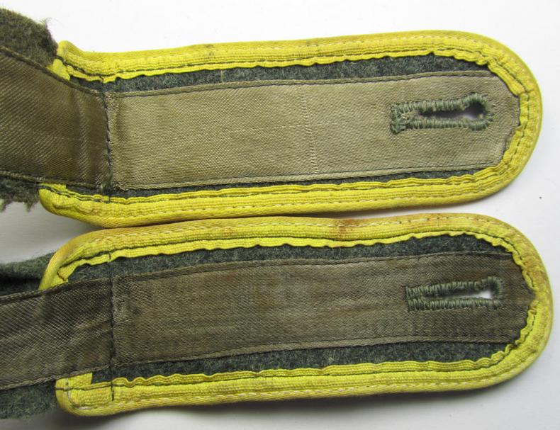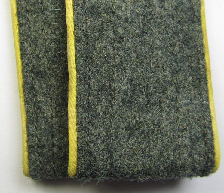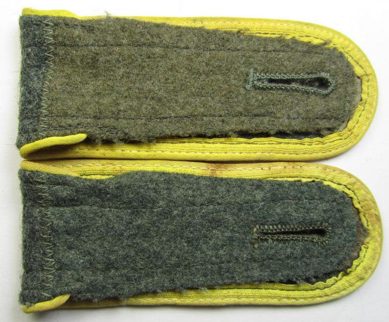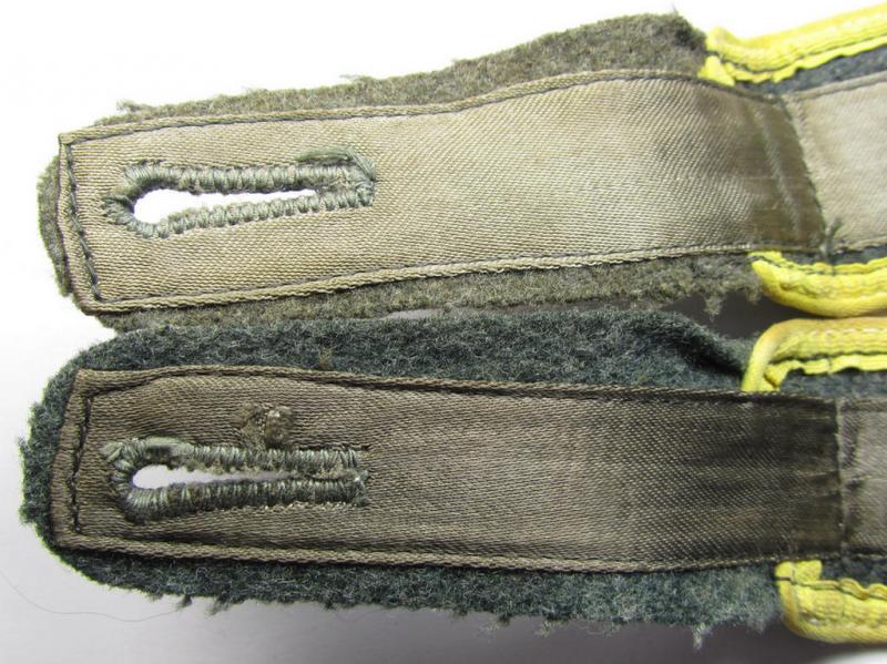 This is an attractive - and fully matching! - pair of later-war-period, WH (Heeres) so-called: 'M44'-style-, 'simplified', enlisted-mens'-type shoulderstraps as was piped in the neat bright-yellow- (ie. 'zitronengelber'-) coloured branchcolour as was intended for - and used by! - a: 'Soldat der Nachrichten-Truppen' (or: simple soldier who served within a later-war-period army signals'-regiment) and that comes in an overall very nice- (ie. moderately used- and/or worn-), condition. The straps - which are approximately 11 cms. sized in length each - have the 'standard-pattern'- and/or typical, field-grey-coloured and/or woolen-based 'upperdecks' (executed in so-called: Italian wool aka 'drap Orti') and do show the bright-yellow- (ie. 'zitronengelber'-) coloured and/or: 'silk-like'-type branchcolour (ie. piping) attached. The straps are constructed following the typical '1944 cloth-minimising production-manner', using different shades of wool and/or material (as can be seen on the pictures). The straps show some minimal staining and/or age caused by moderate wear and/or decades of storage. It should be noted that all 'M44'-style, EM-pattern shoulderstraps are actually quite hard to encounter and can easily be graded 'scarce'. Simply a nice occasion to acquire an attractive - and fully 'text-book'! - M44-styled, enlisted-mens'-type shoulderstrap-pair as was intended for usage by a: 'Soldat der Nachrichten-Truppen': great to complete any later-war M44- (ie. even M43-) model 'Heeres'-tunic!