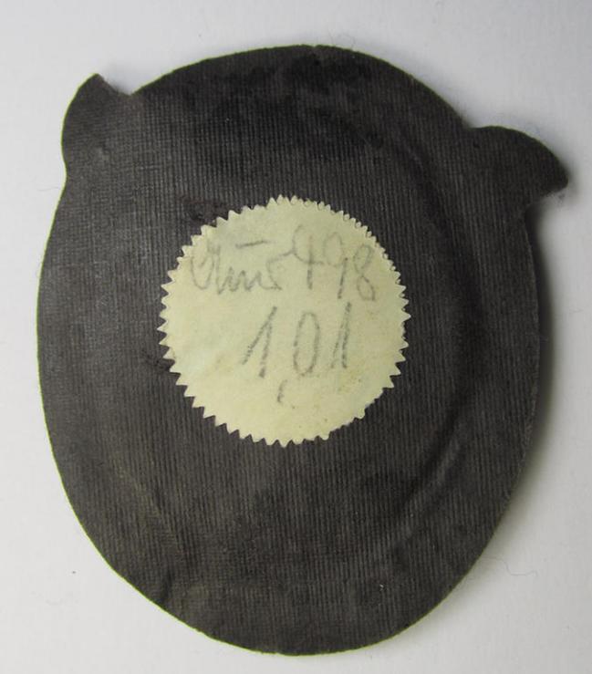 Superb example of a WH (Luftwaffe) so-called: 'Fliegerschützen-Abzeichen mit Blitzbündel in Stoff' (or: cloth air-gunners-badge with lightning bolts) being a machine-stitched- and/or nicely 'padded' specimen that still shows its inventory-etiket