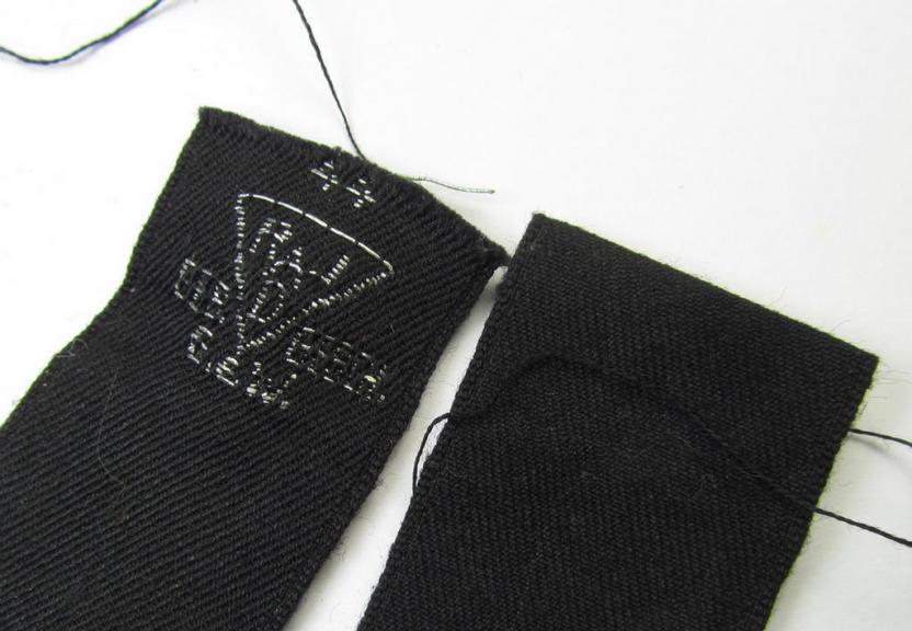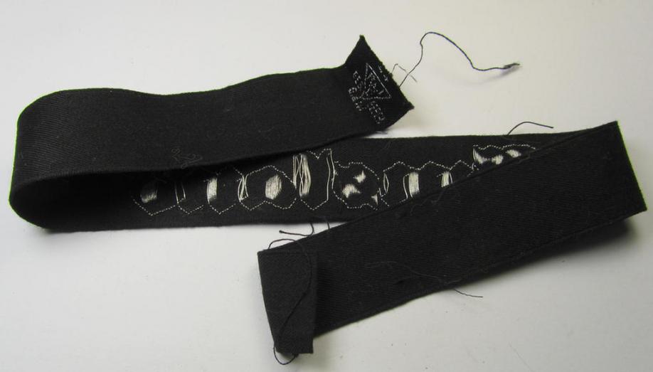 This is an attractive RAD (ie. 'Reichsarbeitsdienst') - I deem - officers'-pattern, commemorative cuff-title (ie. 'Dienstärmelstreifen für Führer') depicting the interwoven text: 'Emsland' (as was presumably intended for staff working on the various 'Westwall'-fortifications in the Emsland-region) and that comes in an overall nice- (albeit moderately used- and/or clearly tunic-removed-), condition. These RAD-cuff-titles (or in German language known as: 'Dienstärmelstreifen') were worn on the lower-left sleeve of the mustard-brown-coloured RAD-tunics. The cuff-title is neatly executed in bright-silver-coloured braid in so-called: 'BeVo'-flat-wire weave-technique and was intended for RAD officers that were (most likely) employed in various 'Westwall'-fortifications. There is, however, an on-going discussion on the exact usage and signifigance of these RAD commemorative-cuff-titles (which were I deem introduced by an order dated March 1939). This exampe is neatly maker-marked and displays the interwoven 'Ges.Gesch.'-designation as is more often found on RAD cloth-insignia (as can be seen on the pictures). This example - which is just minimally shortened and measures now 41 cms. in length - originates from a small collection of RAD cloth-insignia I recently acquired. This example was clearly worn (some minimal stitching-marks are visible) but comes in an overall very nice condition. Simply an attractive piece of RAD-insignia that is with certainty accordingly priced!
