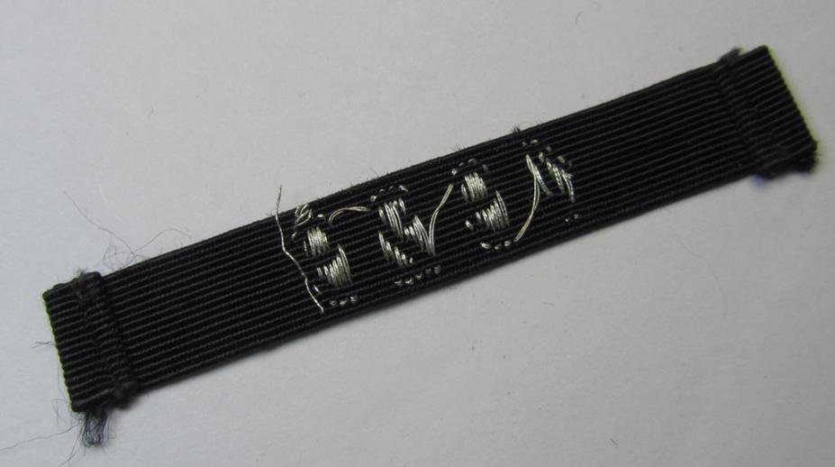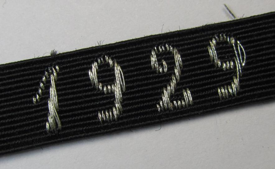 This is a neat - and actually fairly unusually encountered! - so-called: 'N.S.D.A.P.-Verdienst-Abzeichen' being an example as was intended for the year: '1929' and that comes in an overall very nice- (albeit I deem only slightly worn- ie. tunic-removed-), condition. These small (ie. 7 x 1 cms.-) sized black-coloured- and/or linnen-based 'stripes' depict the year of entry within the 'N.S.D.A.P.-party and were worn on the upper-left arm (above the 'Armbinde') on the various N.S.D.A.P. uniforms and/or tunics. The year-nomination is nicely machine-stitched in silver-coloured so-called: 'flat-wire'-technique (as can be seen on the pictures). The neat piece shows some minimal staining ie. discolouration caused by normal wear ie. storage (nothing shocking though). Simply an attractive - and actually unusually encountered (early!) 'N.S.D.A.P.'-related cloth-insignia-piece that is accordingly priced!