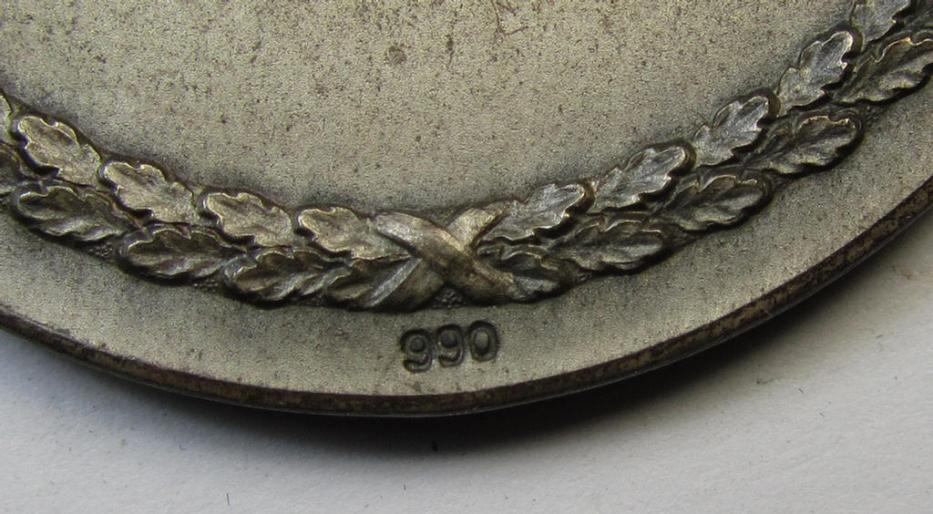 This is a very attractive - and with certainty not that often- ie. most certainly scarcely encountered! - silver-toned- (and I deem silver-toned, 'Buntmetall'-based) so-called: N.S.K.K.-related commemorative-plaque (ie. 'Erinnerungs- o. nichttragbare Auszeichnungsplakette') showing a detailed and pronounced N.S.K.K.-eagle-device and text: 'Für Sportliche Leistungen' and that comes stored in its period (and nicely maker-marked!) etui as issued and stored for decades and that comes in an overall wonderful and truly nicely preserved, condition. The neat - medium-sized- and/or regular-weight-piece (having an approximate diameter of 5,0 cms.) has truly pronounced detail and was never cleaned nor polished: it has maintained a neat typical, silver-toned age-patina (but also shows some minimal tarnish as can be seen on the pictures). The piece shows a silver-content-mark (that reads: '990'). The back of the medal shows the engraved text: '3-Tage Harzfahrt 1934' (as can be seen on the pictures). The piece came stored in its period bright-red-coloured- and/or luxuriously-styled etui ie. box as issued and stored for decades. This etui comes in an equally nicely preserved condition and shows in its top-lid a detailed so-called: N.S.K.K.-eagle-device and makers-designation that reads: 'Robert Neff -Berlin - Bülowstr. 101'. These attractive - semi-official - N.S.K.K.-presentation-pieces were presumably used as some sort of awards as (presumably) handed-out at a specific N.S.K.K.-related sports'-tour held in 1934. Simply a very attractive and with certainty unusually encountered table-medal ie. 'Erinnerungs- o. nichttragbare Auszeichnungsplakette' that might merit some further investigative work!