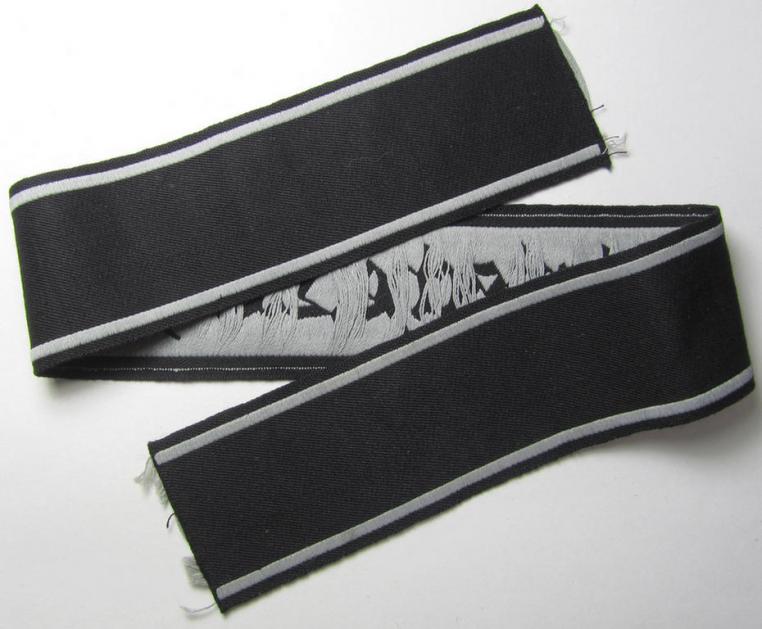 This is a very attractive - and actually scarcely encountered! - example of a so-called: cuff-title (ie. 'Ärmelstreifen') entitled: 'Technische Nothilfe' (= 'TeNo'), being an example as woven in the neat 'BeVo'-weave pattern and that comes in an overall very nice (ie. I deem never used- ie. 'virtually mint- ie. unissued'-), condition. The cuff-title is executed in greyish-blue-coloured linnen as interwoven on a black-coloured (and also linnen-based) background. The piece comes in a full-length condition and measures approximately 44 cms. in length (and having a width of 4 cms.). As usually encountered are both ends 'unfinished' and do show some minor fraying as to be expected. The armband does show some minimal staining simply caused by decades of storage only. Simply and attractive - and naturally genuine! - 'TeNo'-cuff-title that is will be impossible to be upgraded!
