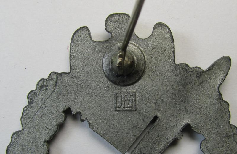 This is an attractive example of the actually scarcely encountered - and truly desirable! - WH (Heeres- ie. Waffen-SS) 'Infanterie-Sturmabzeichen in Silber' (or: silver-class infantry assault badge ie. IAB) being a neatly maker- (ie.'JFS'-) marked example that comes in a truly issued- ie. moderately worn, condition. The badge - which is quite 'vaulted' ie. 'converse' as always - is a typical example as was produced by the: 'Josef Feix und Söhne'- (ie. 'JFS'-) company as was based in the town of Gablonz. The badge (which is as stated neatly maker-marked with the makers'-abbreviation- ie. -logo: 'JFS' on its back) shows some obvious wear, age and/or staining but has retained great pronounced detail and retains an almost fully preserved (neatly silver-coloured) finish: I deem that it was never cleaned nor polished. It comes naturally mounted onto its functional (and fully unaltered) pin- ie. catch set-up (as can be seen on the pictures). Simply a very attractive silver-class IAB that will be hard to be upgraded: I deem that I have priced this desirable war-badge according to its obvious rarity and/or desirability!