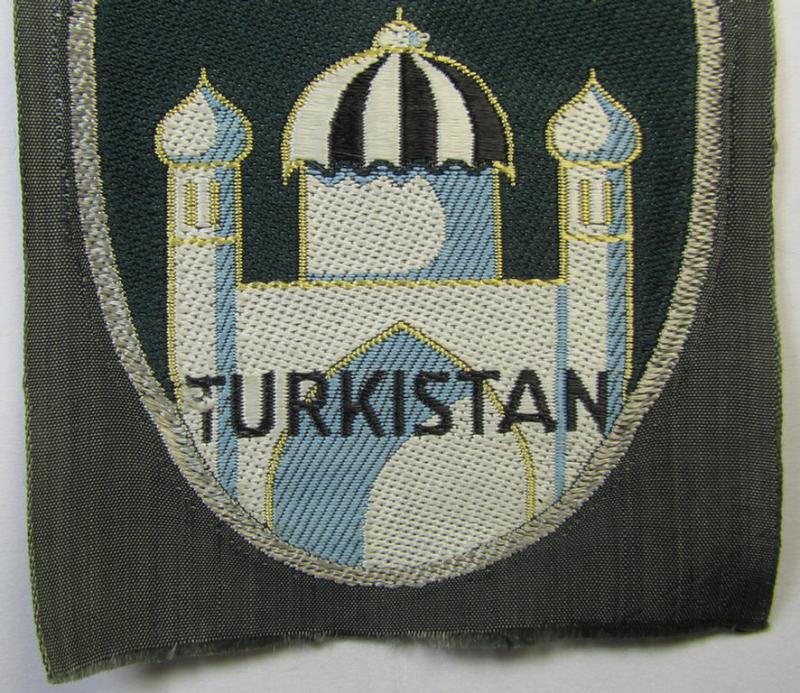 Superb, 'BeVo'-type armshield (of the rarely encountered first pattern!) entitled: 'Biz Alla Bilen - Turkistan' (being a piece that was intended for a volunteer who served within the: 'Deutsche Wehrmacht' ie. within the: 'Turkistanisches Legion')