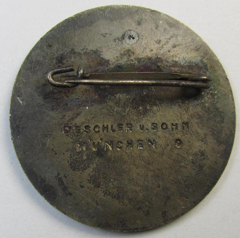 This is an attractive and I deem 'Buntmetall'-based so-called: 'Reichsnährstand'- (ie. 'RNSt.'-) related day-badge (ie. 'tinnie'), as was clearly issued to commemorate an: 'RNSt.'-gathering ie. farmers'-show entitled: '4. Reichnährstands-Austellung - München - 1937' and that comes in an overall nice- (albeit issued ie. moderately worn-), condition. The detailed and/or pronounced badge - which is executed in high-quality, silver-greyish-toned metal (ie. 'Buntmetall') - shows very nice detail and was almost certainly never cleaned nor polished. The piece depicts a (surrealistic) corn-flower, sword- and/or swastika-device surrounded by the above-mentioned text. The badge - which shows a clearly present makers'-designation that reads: 'Deschler & Sohn - München' impressed on its back - comes naturally mounted onto its (functional) pin- ie. pin/catch set-up. Simply a neat - and most certainly not that often encountered! - 'Reichsnährstand'- (ie. 'RNSt.'-) related 'tinnie'!