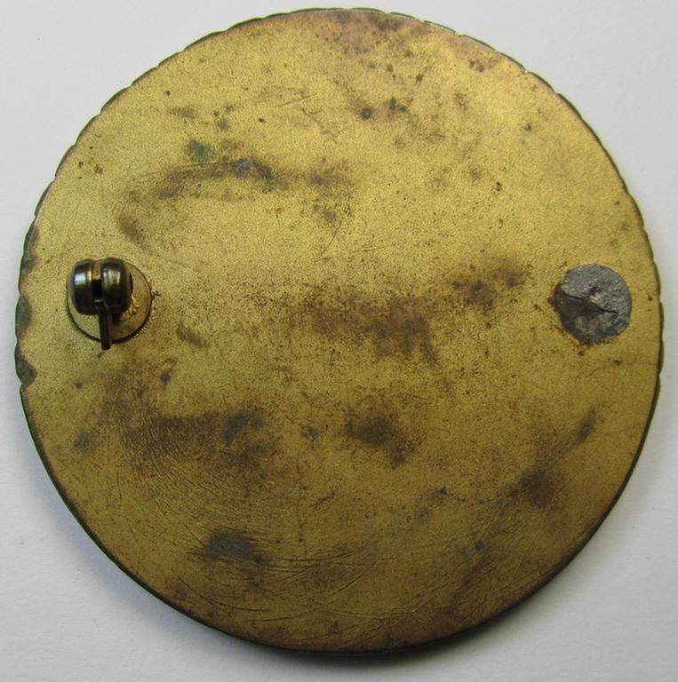 This is a neatly enamelled - and with certainty scarcely encountered! - circular-shaped- and/or truly larger-sized- (pre-war-period- and nationally-held!) shooting-contest-related award or: 'Veranstaltungsabzeichen des Standschützenverbandes Tirol-Vorarlberg' (being an example of a so-called: 'Sonderklasse'!) depicting the text: 'Landesschiessen 1940 - Armeegewehr-Meisterklasse' and that comes in a truly worn- (albeit regrettably incomplete-), condition. The larger-sized badge which is an example of a specific special ie. 'Sonderklasse' - has an approximate diameter of approximately 6,2 cms.(!) and is totally void of a makers'-designation or alike (as can be seen on the pictures). The piece regrettably misses it entire pin- ie. pin-set-up (see pictures). It retains a fully undamaged and bright-golden-toned (and quite shiny!) finish and has an undamaged, multi-coloured- and/or nicely enamelled surface (as can be seen on the pictures). These attractive shooting-event-related badges were awarded (in similar form and/or model) from 1938 onwards and are actually not that commonly encountered: even more so if they were of this specific 'Sonderklasse'!. This attractive example originates from a German private household: it was never before part of a collection. I deem that I priced this attractive (albeit regrettably incomplete but nevertheless 'high-quality-produced') example of a: 'Veranstaltungsabzeichen des Standschützenverbandes Tirol-Vorarlberg' commemorating a shooting-contest named the: 'Landesschiessen 1940 - Armeegewehr-Meisterklasse', accordingly!