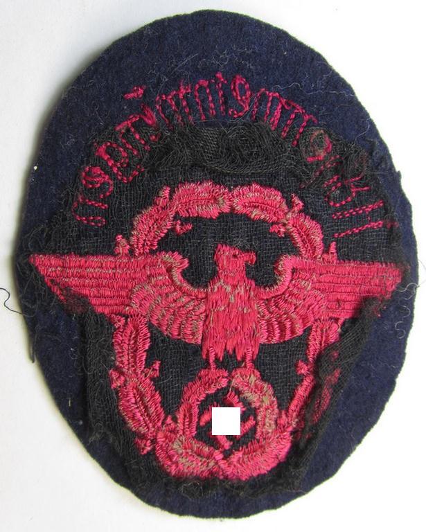 This is an attractive - and actually not that easily found! - example of a truly worn- (and clearly tunic-removed!) so-called: police- (ie. 'Polizei'- or: 'Feuerwehr'-) related arm-eagle (ie. 'Ärmeladler') as was intended for usage by the various (enlisted) staff-members of the: 'Feuerlöschpolizei Hohenmemmingen' (or: specific police-related fire-brigades in the town of Hohenmemmingen') and that comes in an overall nice- (ie. clearly used- and/or: once tunic-attached-), condition. The piece is executed in bright-pink-coloured linnen and comes mounted onto a piece of darker-blue-coloured wool as to be expected (as can be seen on the pictures). These neat arm-eagles were specifically designed for usage by the various staff-members of the: 'Feuerlöschpolizei'-units and saw usage throughout the war. The eagle on offer here shows great pronounced detail and comes in a great condition overall: it shows a partially present additional 'backing' and still shows some minimal thread- and/or stitching-remains (as can be seen on the pictures). Simply a great occasion to acquire an attractive 'Feuerlöschpolizei'-related 'Ärmeladler' for a competitive price!