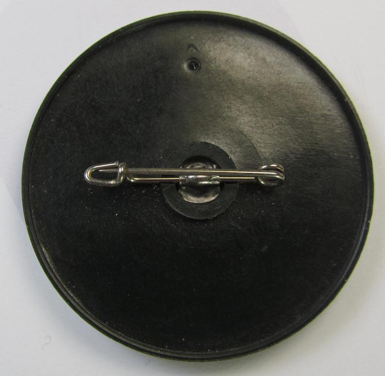 This is an attractive, round-shaped WHW- (ie. 'Winterhilfswerk'-) related day-badge (ie. 'tinnie' or: 'Veranstaltungsabzeichen') as was executed in black-coloured- and/or 'resin'-based material as was issued to commemorate participation in a specific WHW-related-gathering and that bears the text: 'Wir gehören zusammen dann sind wir alles - Gau Kurhessen - 1936-1937' and that comes in an overall very nice (albeit issued ie. moderately worn-), condition. The very detailed and/or pronounced badge shows extraordinary detail and was almost certainly never cleaned nor polished: almost all of its finish has been nicely preserved (as can be seen on the pictures). The piece shows a 'Reichadler'-symbol with below the 'WHW'-characters surrounded by the text: 'Wir gehören zusammen dann sind wir alles - Gau Kurhessen' (as can be seen on the pictures). The badge - which is totally void of a makers'-designation - comes naturally mounted on its (functional-) pin- ie. catch set-up. Simply an attractive WHW- (ie. 'Winterhilfswerk'-) related 'tinnie'!