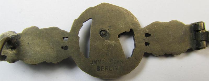 This is a truly very attractive and/or pronounced, 'Buntmetall'-based example of a clearly maker- (ie. 'Imme u. Sohn - Berlin'-) marked specimen of a WH (Luftwaffe) 'Frontflugspange für Aufklärer in Silber' (or: silver-class, reconnaisance pilots'-clasp ie. FFS) that comes as issued and/or stored for decades. The superb piece comes in an overall very nice- (ie. only moderately used- and/or worn-) condition and retains simply extraordinary detail. It retains most (ie. all!) of its period-applied, silver-toned finish: the bluish-black-coloured- (and/or 'Buntmetall'-based-) eagles'-head-device (which is additionally attached to the clasp with a single- and unaltered rivet) is equally detailed and also retains all of its silver-toned and minimal 'tarnished' finish (as can be seen on the pictures). The clasp comes naturally in great shape ie. order: the (silver-coloured- ie. also 'Buntmetall'-based-) pin- ie. pin/catch-attachment and/or single rivet are in fine (and/or undamaged nor repaired-) order. The catch is also in great undamaged order and of course fully functional. The clasp - which is a quality-produced example as was produced by the: 'Imme u. Sohn'-company (as is more often the case) - has never been cleaned nor polished and has a neat and/or tarnished 'age-patina'. The clasp originated from a private household in Germany and was never before part of any collection. Simply a very attractive - and not that often encountered! - fairly 'high-class', Luftwaffe-award that is accordingly priced!