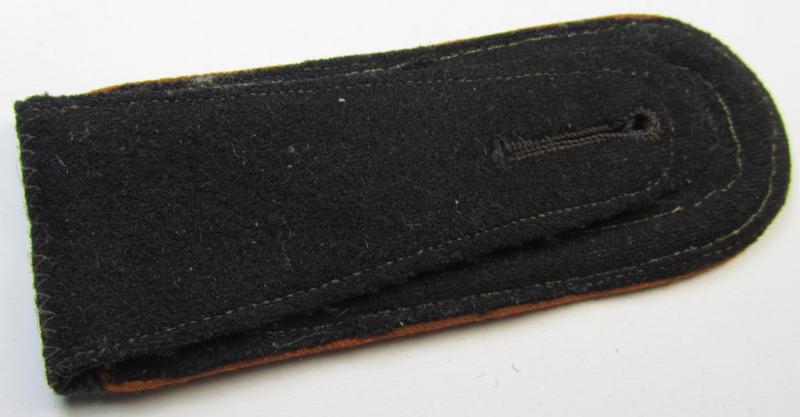 This is a truly very attractive - albeit regrettably single albeit nevertheless still rarely found! - Waffen-SS NCO-type- (ie. I deem fairly early-war-pattern) shoulderstrap as piped in the neat bright-orange- (ie. 'orangeroter'-) coloured branchcolour as was intended for usage by an NCO (ie.: 'Unterscharführer' ie. junior-sergeant) who served within the: 'Waffen-SS Feldgendarmerie-Truppen' (or: field-police troops) and that comes in an overall very nice- (albeit moderately used ie. worn-), condition. The strap - which comes mounted onto its original and/or regular-shaped tongue as more often encountered on early-war-pattern Waffen-SS-type shoulderstraps - has the bright-orange- (ie. 'orangeroter'-) coloured and/or: desirable 'silk-like'-type piping attached (as can be seen on the pictures). The back of the strap (which measures 11,2 cms. in length as more often encountered) is executed in the black-coloured wool, as is more often observed with genuine (early-pattern!) Waffen-SS-type shoulderstraps. The piece - which can I deem be dated around 1941/42 - shows some moderate age, wear and/or staining (as can be seen on the pictures). The strap shows the (standard-pattern) silverish-coloured NCO-braid period-attached denoting that it was intended for usage by an NCO with the rank of: 'Unterscharfüher' (ie. junior-sergeant). Simply a very attractive and fully 'text-book', Waffen-SS-related, NCO-type 'Feldgendarmerie' shoulderstrap that is priced according to its unmistaken rarity and/or desirability!