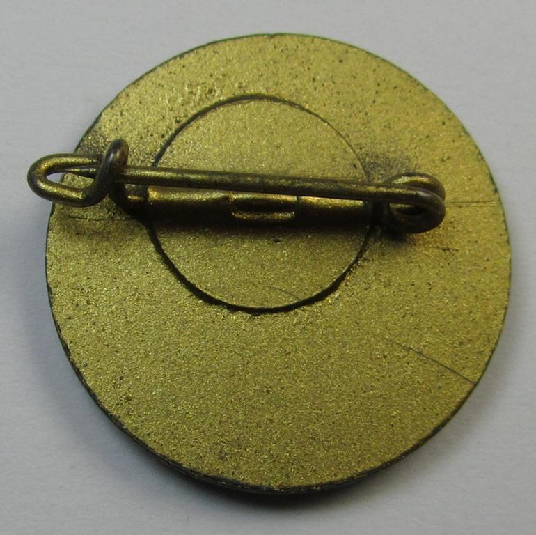 This is a truly attractive - and nicely preserved! - example of a multi-coloured enamelled (and typical zinc- ie. Feinzink-based) so-called: 'Gaumeisterabzeichen in Gold für Pistole 1944 des Standschützenverbandes Tirol-Vorarlberg' being a (scarcely seen!) smaller-sized and/or circular-shaped 'variant'-example that was specifically awarded for a shooting-contest held on the 'Gau'-level (using a pistol ie. 'Pistole') being a non-maker-marked example that comes in an overall nice- (ie. just moderately used- ie. worn-), condition. The very detailed - and somewhat smaller-sized - badge (having an approximate diameter of only 2,5 cms.) is executed in multi-coloured and nicely enamelled (golden-toned) zinc (ie. 'Feinzink'): it is void of any enamel-damage and retains a fully preserved golden-toned finish and green-coloured, enamelled border (just some minimal staining is visible). The badge comes naturally mounted onto its functional- and fully unaltered pin- ie. pin-catch-set-up (as can be seen on the pictures). A similar example is also figured in the Heering-Hüsken lapel-pin-catalogue, wherein it is given the unique reference-number: 'A61UA' and wherein it is given an estimated value of 220 Eu(!). Simply an attractive shooting-award that is offered for an interesting price!