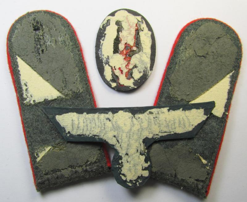This is an attractive - and fully matching - 4-pieced WH (Heeres) insignia-grouping comprising of respectively a (matching!) pair of 'M43'-pattern EM-shoulderstraps, a: 'M36'- (ie. 'M40'-) pattern breast-eagle (ie. 'Brustadler für Mannschaften u. Uffz.') and a: WH (Heeres) trade- and/or special-career-insignia (ie. hand-embroidered 'signal-blitz') all four insignia-pieces as was intended for a: 'Soldat eines Artillerie-Abteilungs o. Regiments'. All four insignia were most certainly issued and probably worn: they were all four once glued into an album or scrapbook and do all four show some carton- ie. glue-remains on their backs (as can be seen on the pictures). The pair of WH (Heeres) enlisted-mens'-type, so-called: 'M43'-pattern shoulderstraps is piped in the typical bright-red- (ie. 'hochroter'-) coloured branchcolour and are approximately 11 cms. sized in length each as more often encountered. They have the 'standard-type'- and/or typical field-grey-coloured- and/or woolen-based 'upperdecks' and show the neat bright-red- (ie. 'hochroter'-) coloured and woolen-type branchcolour ie. piping, attached. The straps were only moderately used- and/or worn and do show some moderate staining and/or age simply caused by moderate wear and/or decades of storage (as can be seen on the pictures). The pair comes without tongues and was presumably cut-of a tunic (as can be seen on the pictures). The WH (Heeres) early- ie. (pre-)war-period, white-coloured breast-eagle is of the so-called: 'M36'- (ie. 'M40'-) pattern (ie. 'Brustadler für Mannschaften u. Unteroffiziere') and is executed in the neat 'BeVo'-weave pattern on a darker-green-coloured background. It comes in an overall very nice (ie. never tunic-attached- albeit confectioned ie. pre-trimmed) condition. The trade- and/or special-career-insignia (ie. 'signal blitz') is executed in the bright-red- (ie. 'hochroter'-) coloured branchcolour as was specifically intended for a 'signals-operator' (or: 'WH-Nachrichten Personal') ie. soldier serving within the: 'Artillerie-Truppen' (ie. artillery-troops). This neat insignia-grouping originated from a private-household in Germany and was never before in collectors'-hands: it can naturally still excellently be used to complete or restore a WH (Heeres) tunic. Simply an attractive insignia-set that belonged to a: 'Soldat eines (Sturm)-Artillerie-Abteilungs o. Regiments'!