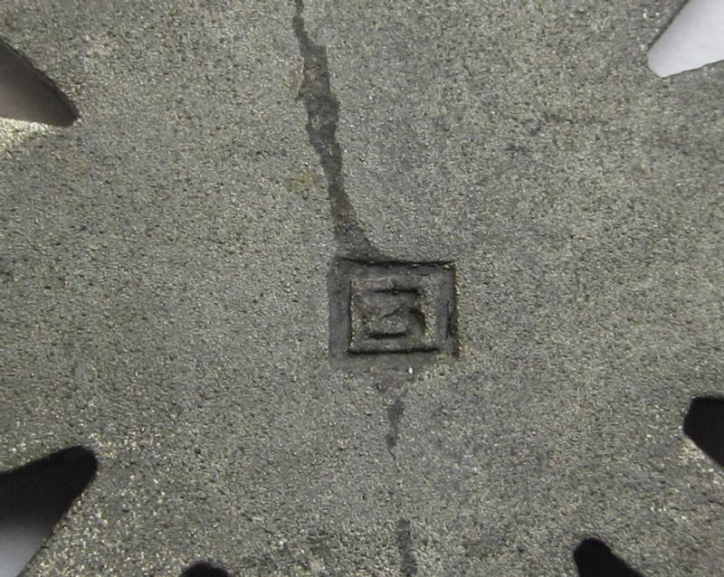 The attractive - and I deem mid- (ie. later-) war-period - piece is executed in typical greyish-silver-coloured- and/or zinc-based metal (ie. 'Feinzink') and comes in an overall nice- (albeit moderately worn- ie. most certainly used-), condition. The naturally non-magnetic- and/or non-vaulted cross shows some blackened- ie. tarnished age-patina but was most certainly never cleaned nor polished: it has lost, however, most (ie. all) of its typical silverish-grey-coloured finish that has just 'faded away' over the years as more often (as can be seen on the pictures). The cross comes naturally mounted on its functional (flute-shaped) pin- and/or: period catch (ie. catch-set-up) which are both present and fully unaltered (as can be seen on the pictures). The piece - which shows a clearly present makers'-designation '3'-stamped onto its back (as always) - comes as found and stored for decades: it was truly never cleaned and is still a bit stained ie. dirty (as can be seen on the pictures). I deem that the KvK 1st class award is a bit underestimated by the collectors' community: they can almost be graded equally as the IC 1st class. Simply an attractive example that was produced by the desirable maker: 'Wilhelm Deumer' and that is accordingly priced!