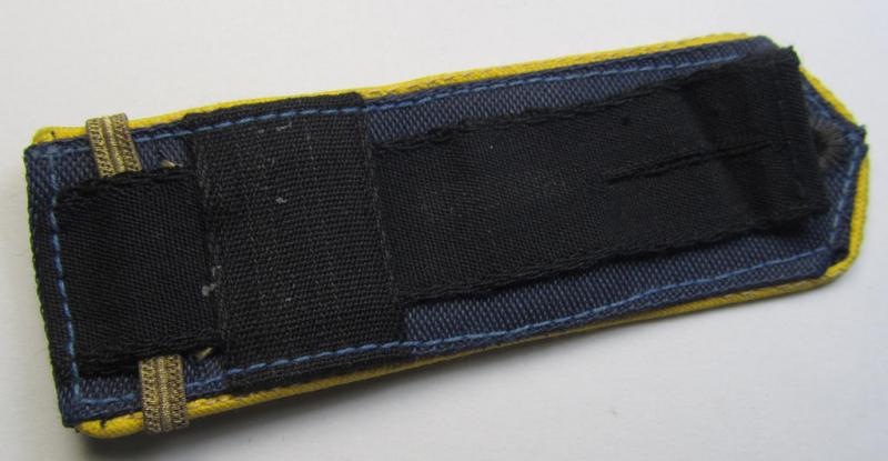The attractive - and actually not that often ie. scarcely seen! - 'Marine-HJ' (ie. naval 'Hitlerjugend') shoulderstrap was - I deem - only minimally used- ie. worn and comes in an overall very nicely preserved, condition. The neat strap - which is executed in dark-blue-coloured linnen having the bright-yellow-coloured- and/or neatly machine-embroidered '663'-numerals (ie. 'Ziffern') and/or equally coloured (rayon-based) piping attached - never had a paper-based 'RzM'-etiket attached and comes mounted onto its original tongue as found and/or issued. The board measures 11 cms. in length each as usually encountered and shows some minimal age ie. staining, simply caused by decades of storage and/or moderate wear. The strap shows two (indentical, golden-coloured and/or zinc-based) pips and a single stripe of golden-toned 'HJ-type braid' attached, denoting the HJ-members'-rank of: 'Oberscharführer' (ie. sergeant first-class). It should be noted that all 'Marine-HJ' (ie. naval 'Hitlerjugend') shoulderstraps can easily be graded 'very scarce'!