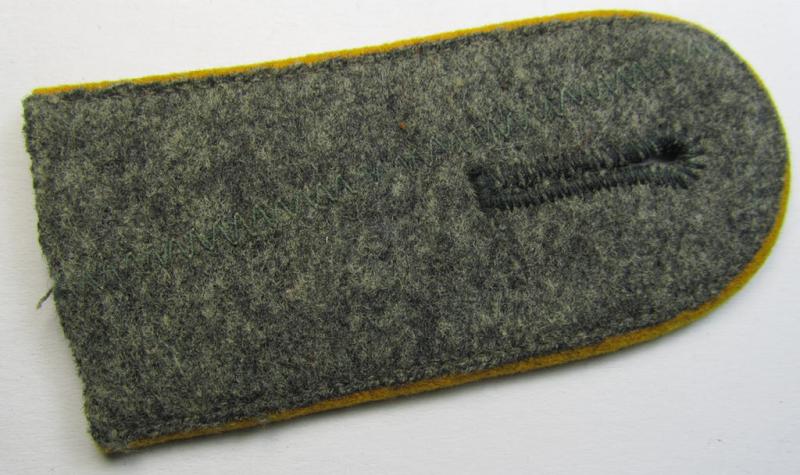 This is an attractive - albeit regrettably single but nevertheless scarcely found! - example of a WH (Heeres), early-war period- (ie. 'M36'- ie. 'M40'-pattern and/or rounded-style) neatly 'cyphered', EM-type shoulderstrap as was piped in the desirable golden-yellow- (ie. 'goldgelbener'-) coloured branchcolour as was intended for usage by a: 'Soldat des Kavallerie o. Reiter-Regiments 15' (or: simple cavalry soldier who served within the cavalry-regiment, numbered: '15') and that comes in an overall nice- (ie. moderately used- ie. worn- and/or carefully 'cut-off'-), condition. The neat strap - which has the 'standard'-pattern, darker-green-coloured and/or 'smooth woolen'-based 'upperdeck' - show the neat golden-yellow- (ie. 'goldgelbener'-) coloured branchcolour - (and/or woolen-type-) piping attached (as can be seen on the pictures). The strap measures approximately 9,6 cms. in length and never had a tongue attached: it was clearly used as a strap of the 'sew-in'-pattern and comes in a very nice- (ie. fully 'text-book') condition, overall. The strap shows the neat machine-embroidered (by means of so-called: 'Kurbelstickerei') '1'- and/or '5'-numerals (ie. 'Ziffern') which are executed in the golden-yellow- (ie. 'goldgelbener'-) coloured wool as to be expected (as can be seen on the pictures). The strap - which is of the 'standard-issued' pattern - shows as stated above only moderate usage and wear (just some minimal age, dust and/or staining is visible and/or present). It should be noted that ALL 'cyphered', enlisted-mens'-pattern 'Kavallerie'-type shoulderstraps can easily be regarded 'scarce'. In any case a very attractive and/or: early-war-period, 'Heeres-Kavallerie'-related, EM-type shoulderstrap that was intended for usage by a: 'Soldat des Kavallerie o. Reiter-Regiments 15': too bad that it is only a single specimen!